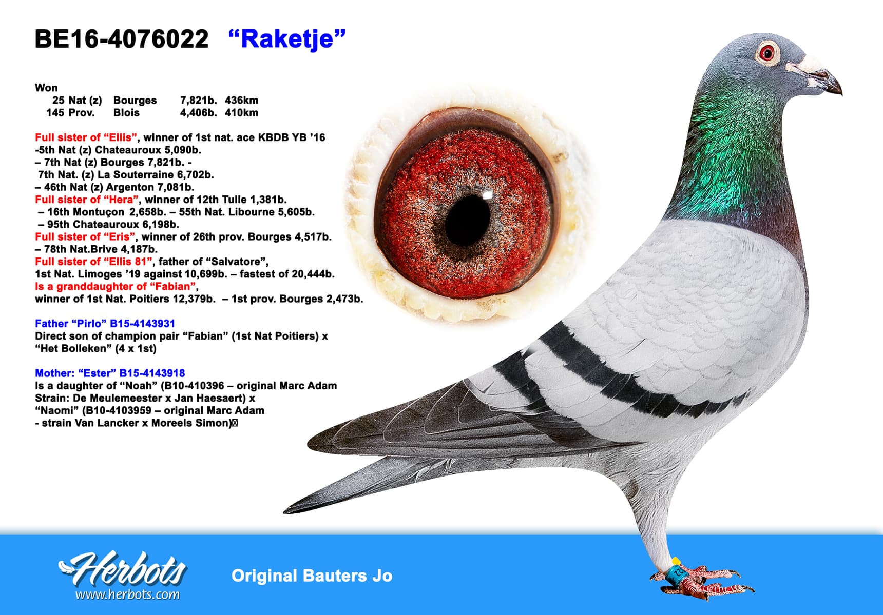 Direct son of “Raketje”, winner of 25th Nat (z) Bourges7,821b. and full sister of 1st Nat. ace KBDB “Ellis”