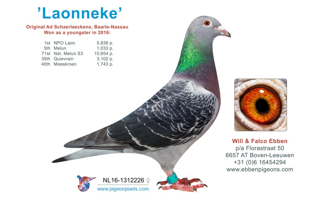 Is a half-sister to “Pizza” (1st and 2nd Nat. ace) - “Pandemic” (4th Nat. ace) – “Lady Guusje” (9th Nat. ace) – “Nanko” (22nd and 27th Nat. ace) - “Linus 042” (1st/3,102b.) – “Nora” (3 x 1st club)