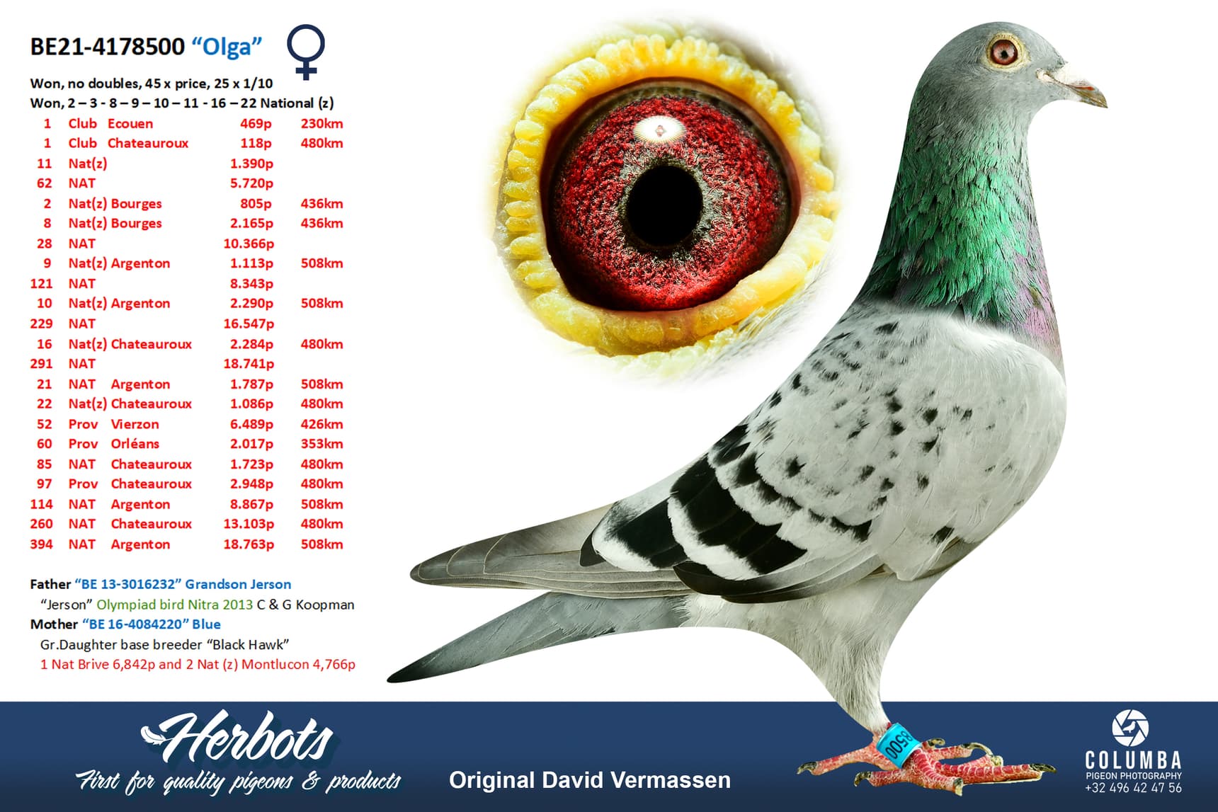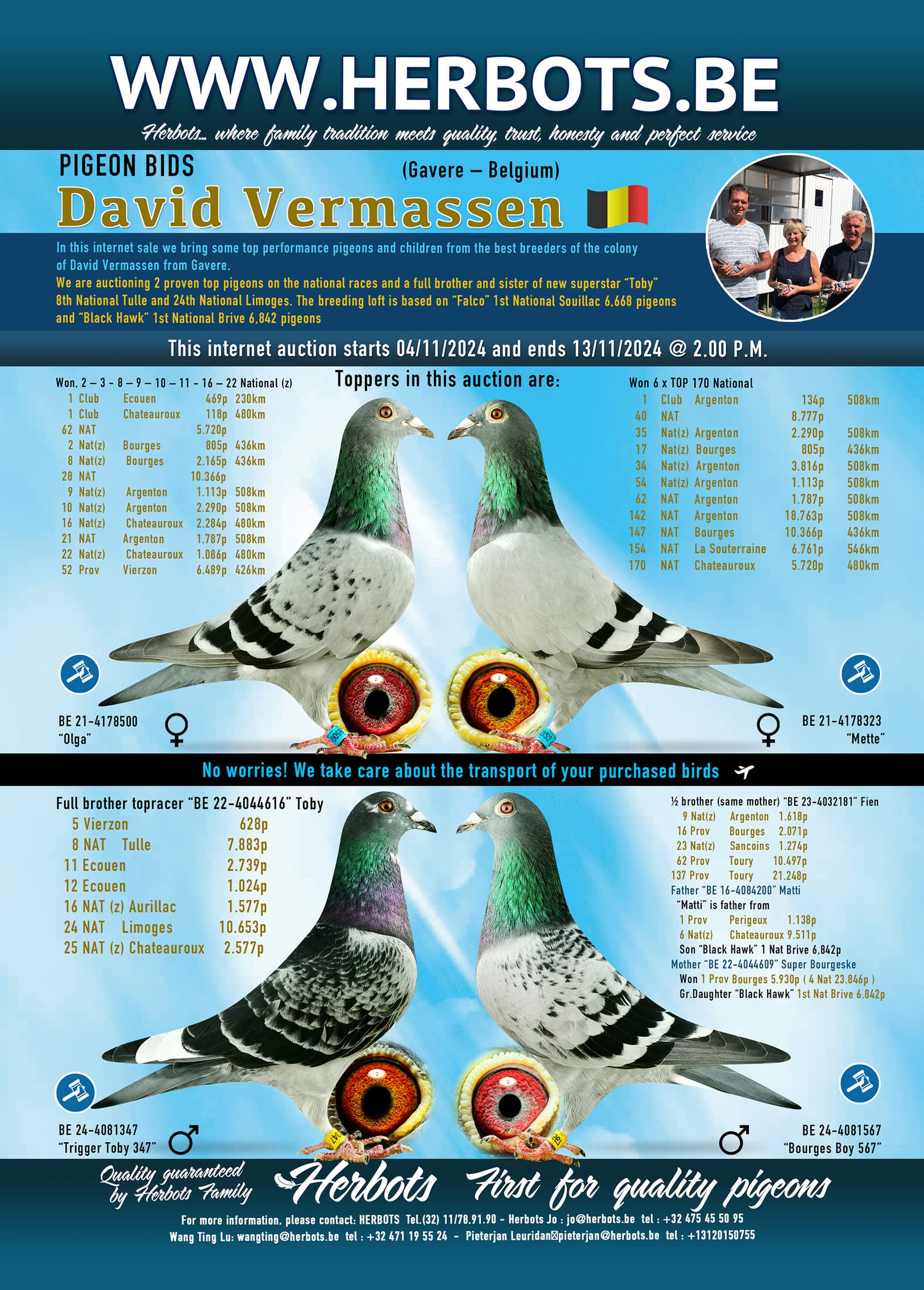 In this internet auction we bring some top performance pigeons and children from the best breeders of the colony of David Vermassen from Gavere.