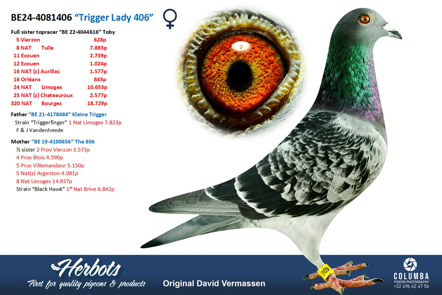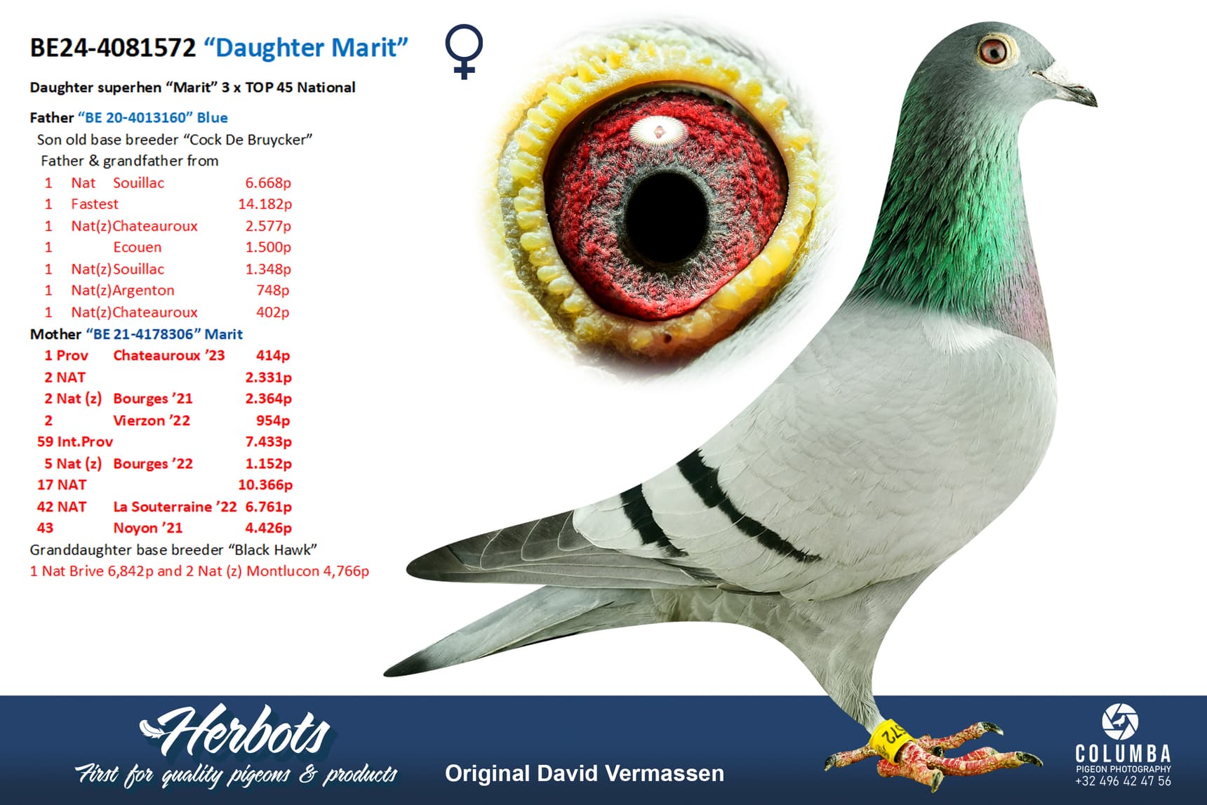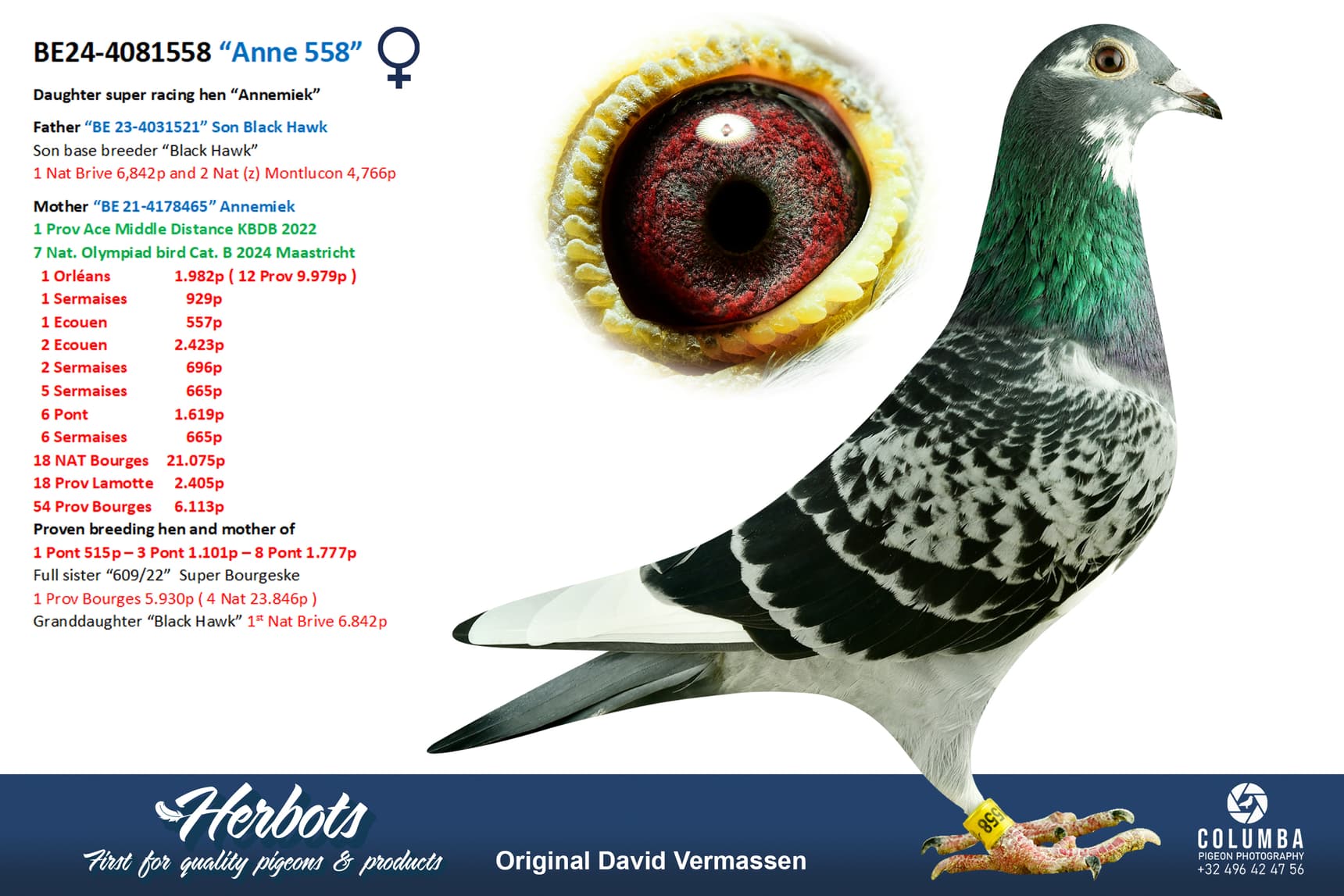 "Anne 558" is a daughter from "Annemiek" 1 Provincial Ace M.D. KBDB 2022 - 7 Olympiad bird Cat.B 2024 Belgium and won 3 x 1st