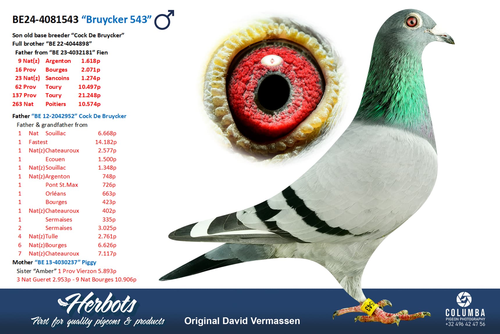 "Bruycker 543" Son from old base couple "De Bruycker" x "Piggy". Is a full brother from father "Fien" 9 Nat (z) Argenton 1.618p, 16 Prov Bourges 2.071p, 23 Nat(z) Sancoins 1.274p, 62 Prov Toury 10.497p
