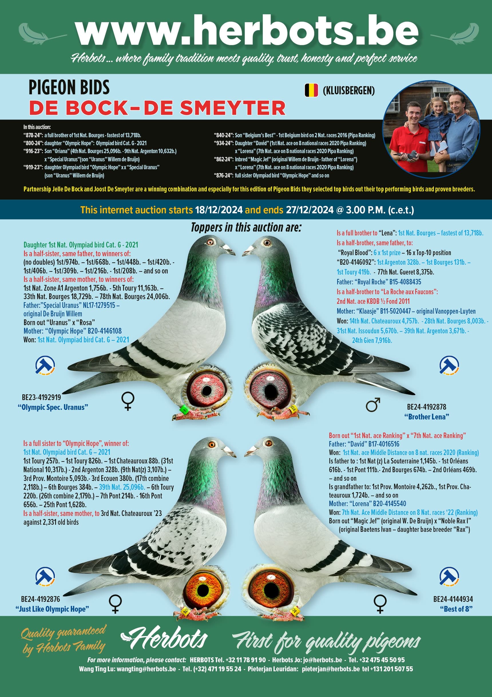 Partnership Jelle De Bock and Joost De Smeyter are a winning combination and especially for this edition of Pigeon Bids they selected top birds out their top performing birds and proven breeders.