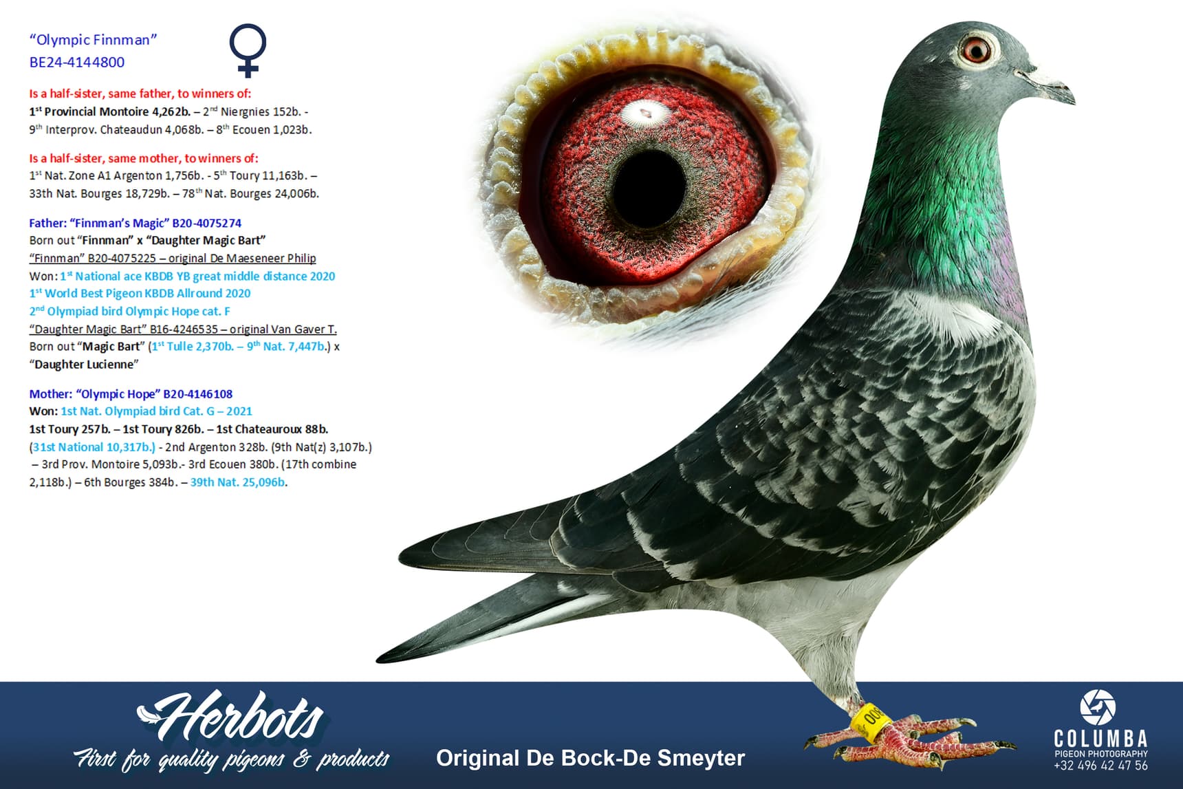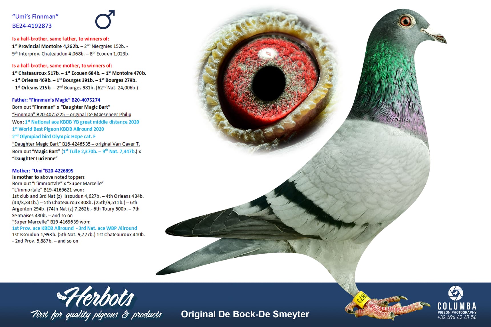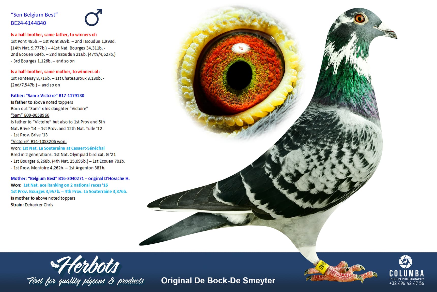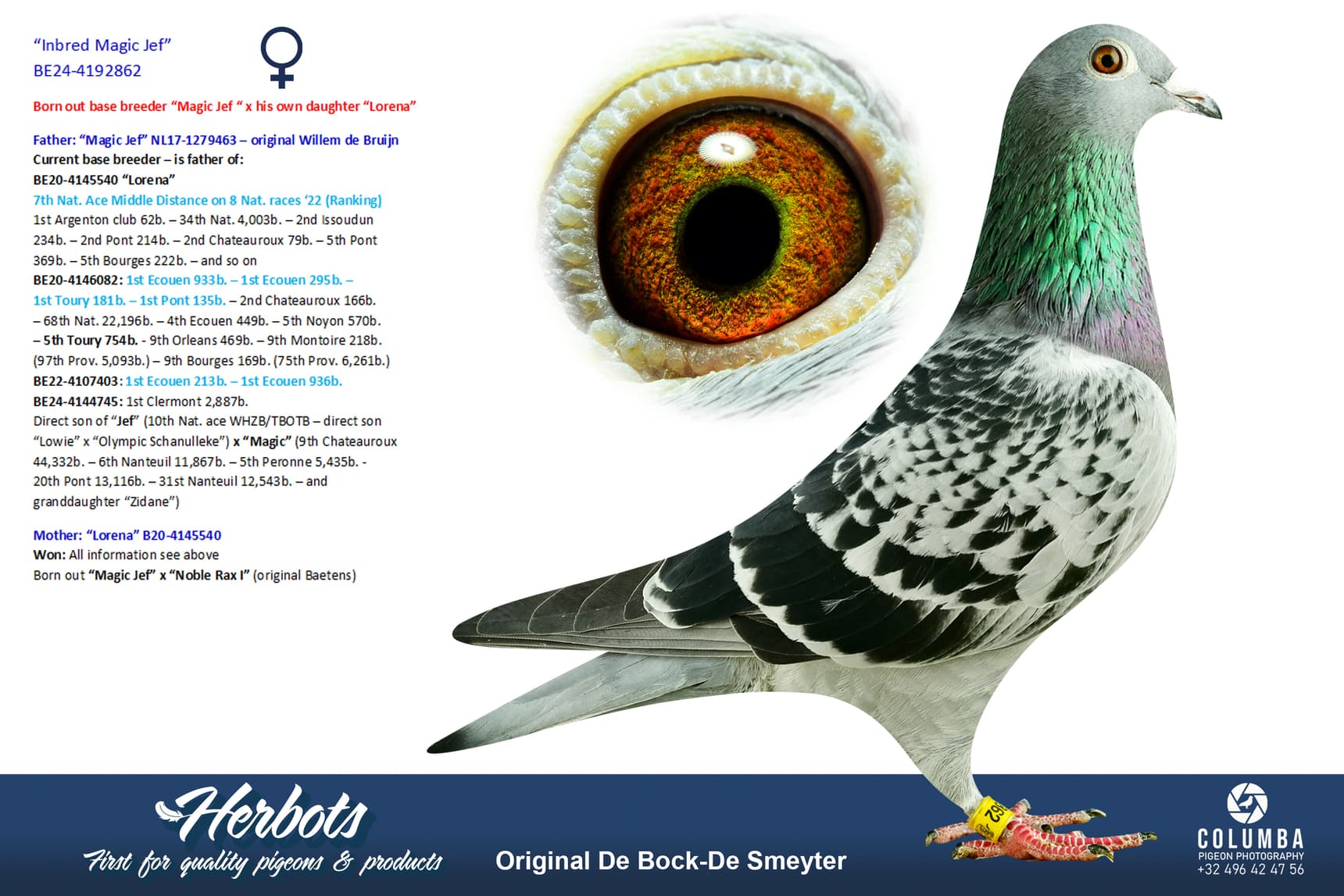 Direct son of “Jef” (10th Nat. ace WHZB/TBOTB – direct son“Lowie” x “Olympic Schanulleke”) x “Magic” (9th Chateauroux 44,332b. – 6th Nanteuil 11,867b. – 5th Peronne 5,435b. - 20th Pont 13,116b. – 31st Nanteuil 12,543b. – and granddaughter “Zidane”)