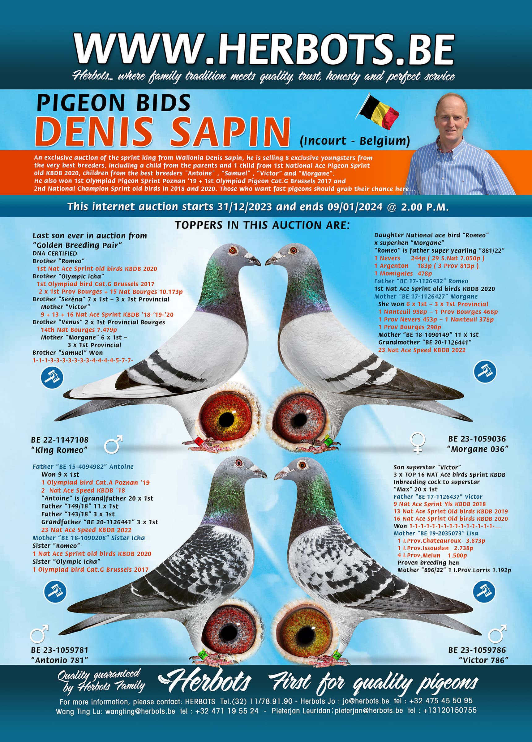 An exclusive auction of the sprint king from Wallonia Denis Sapin, he is selling 8 exclusive youngsters from the very best breeders, including a child from the parents and 1 child from 1st National Ace Pigeon Sprint old KBDB 2020, children from the best breeders "Antoine" , “Samuel” , “Victor” and “Morgane”. He also won 1st Olympiad Pigeon Sprint Poznan ’19 + 1st Olympiad Pigeon Cat.G Brussels 2017 and 2nd National Champion Sprint old birds in 2018 and 2020. Those who want fast pigeons should grab their chance here…
