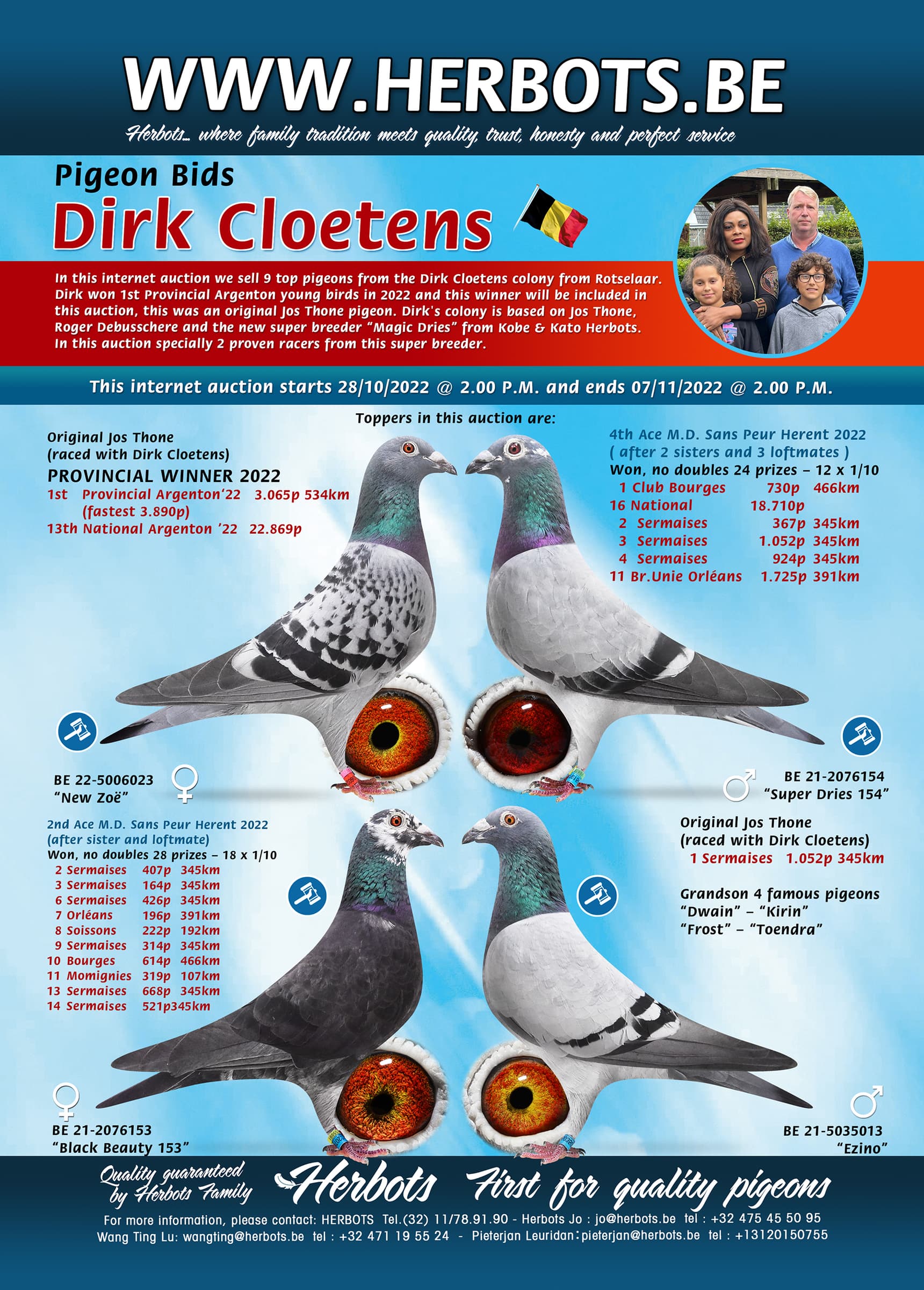 In this internet auction we sell 9 top pigeons from the Dirk Cloetens colony from Rotselaar. Dirk won 1st Provincial Argenton young birds in 2022 and this winner will be included in this auction, this was an original Jos Thone pigeon. Dirk's colony is based on Jos Thone, Roger Debusschere and the new super breeder “Magic Dries” from Kobe & Kato Herbots. In this auction specially 2 proven racers from this super breeder.