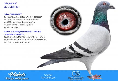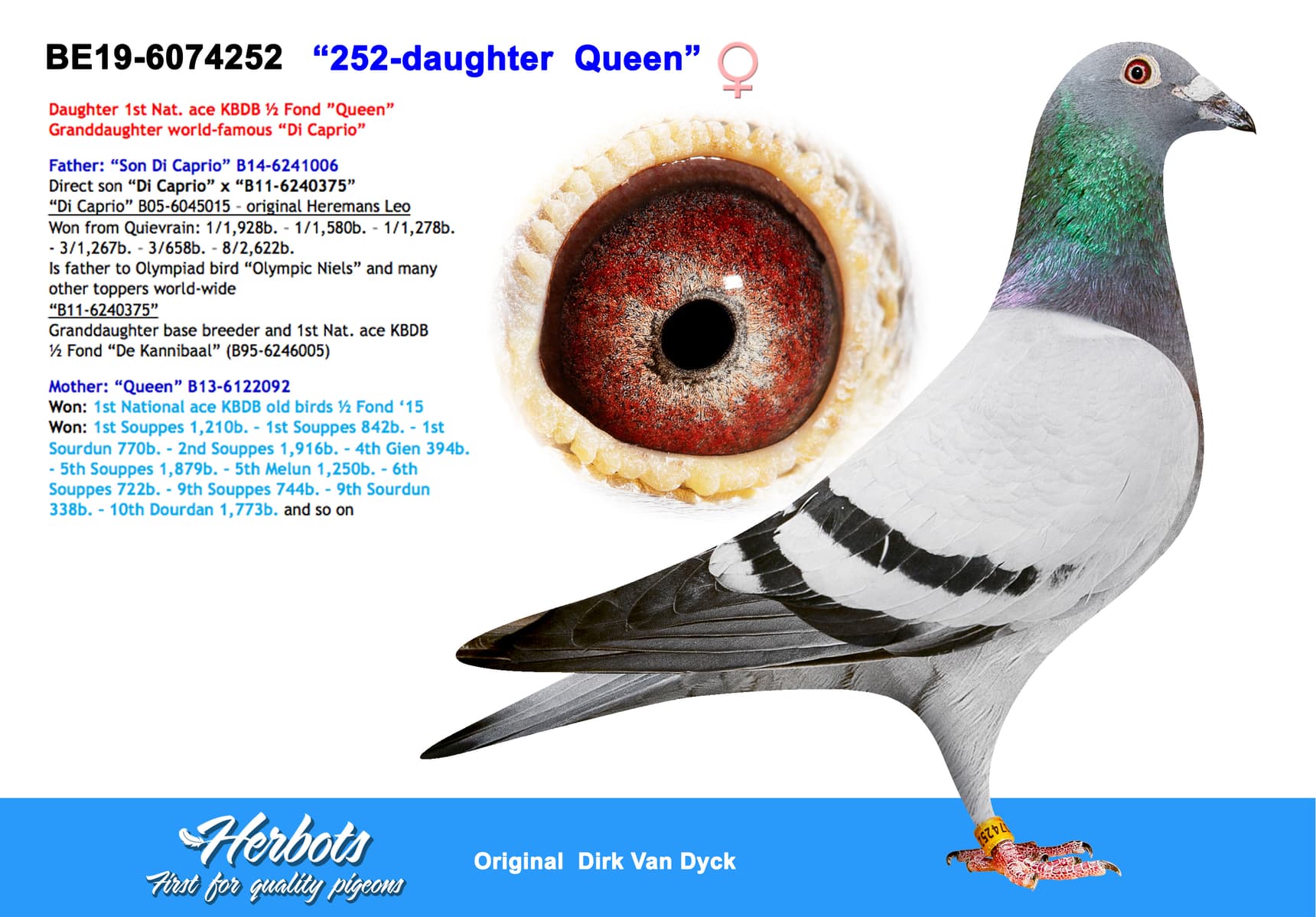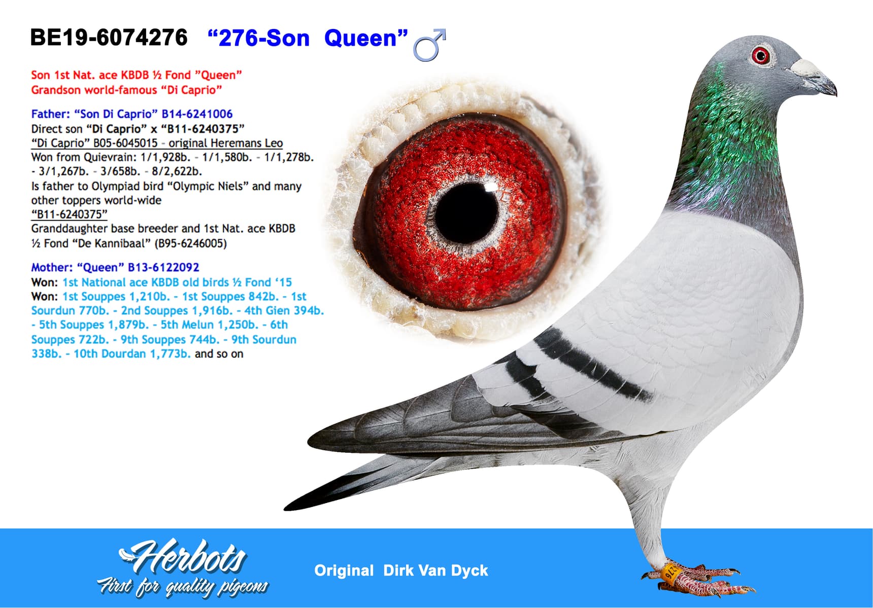and, of course, several grandchildren of world-famous "Di Caprio" - grandchildren Olympiad pigeon "Olympic Niels" - grandchildren 1st Nat. ace KBDB "Blauwe Staf" - grandchildren "Blauwe Kannibaal Junior" - grandchildren "Ronaldo" (9 x 1st) - grandchildren "Jannes" (1st Nat. Montluçon - fastest of 28,034b.) - grandchildren "Little Queen" (3rd Nat. ace KBDB 1/2 fond yearling) - and so on