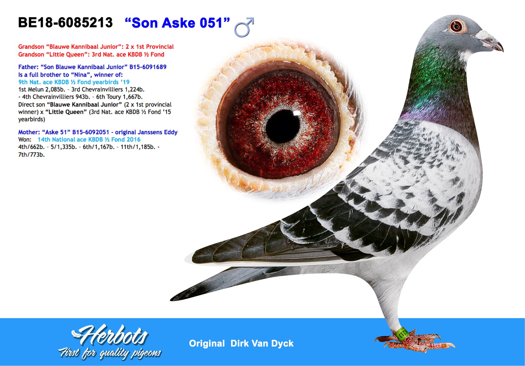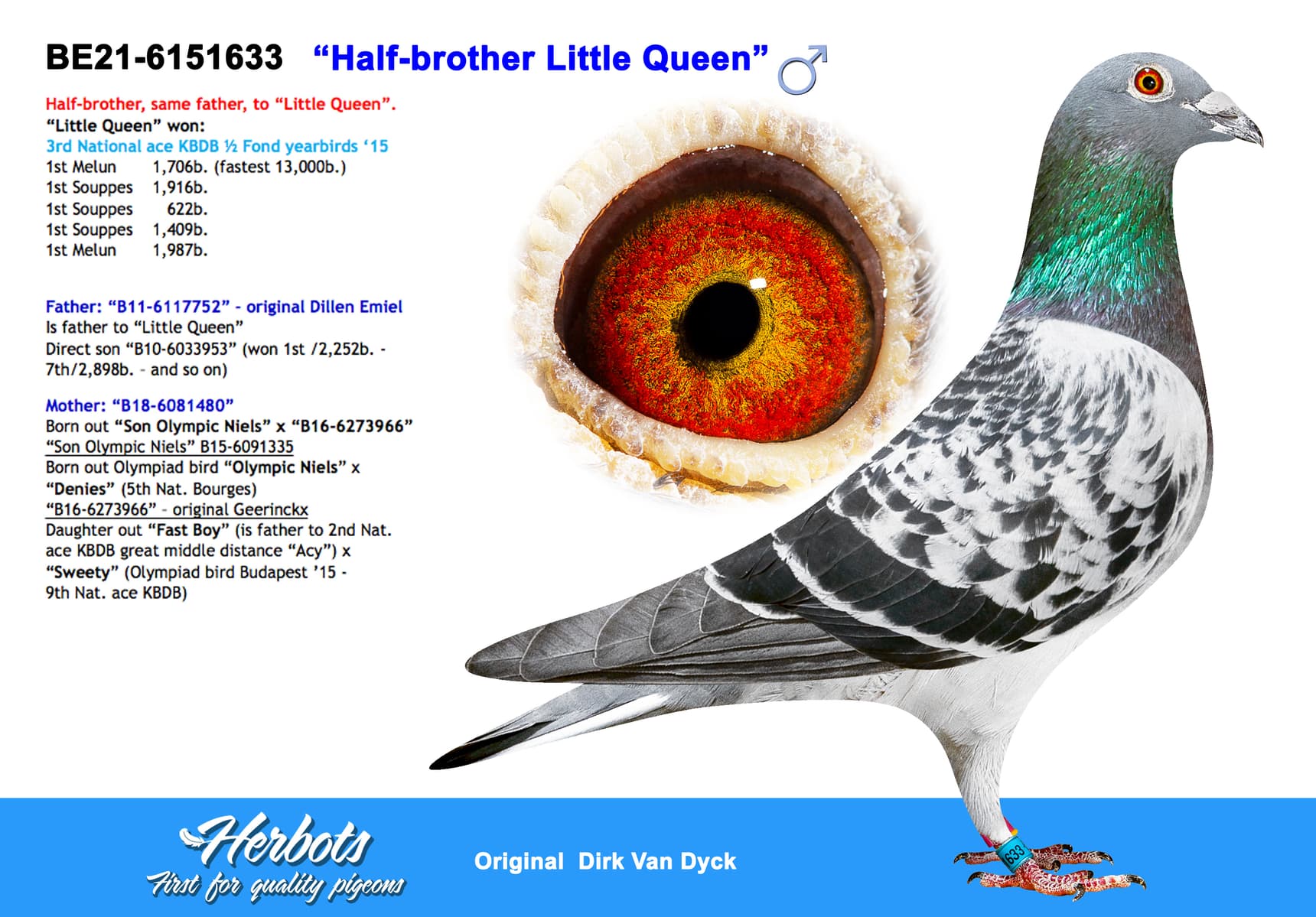 Direct son “Blauwe Kannibaal Junior” (2 x 1st provincial winner) x “Little Queen” (3rd Nat. ace KBDB ½ Fond ’15 yearbirds)