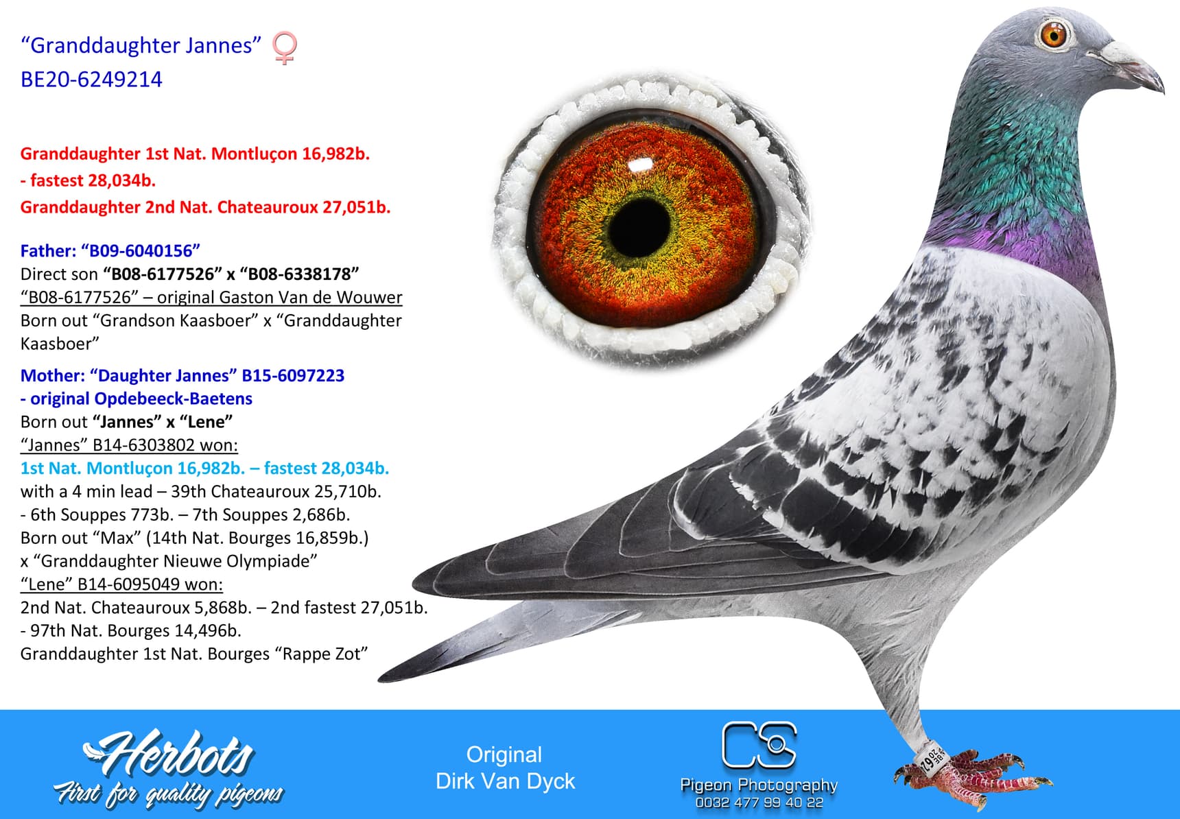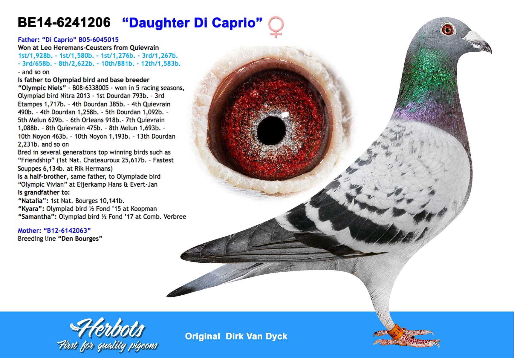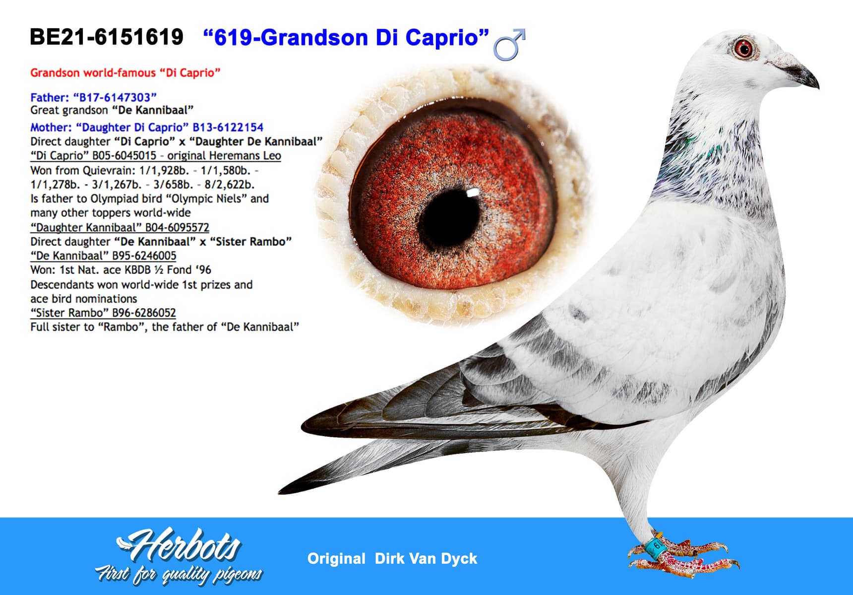 and, of course, several grandchildren of world-famous "Di Caprio" - grandchildren Olympiad pigeon "Olympic Niels" - grandchildren 1st Nat. ace KBDB "Blauwe Staf" - grandchildren "Blauwe Kannibaal Junior" - grandchildren "Ronaldo" (9 x 1st) - grandchildren "Jannes" (1st Nat. Montluçon - fastest of 28,034b.) - grandchildren "Little Queen" (3rd Nat. ace KBDB 1/2 fond yearling) - and so on