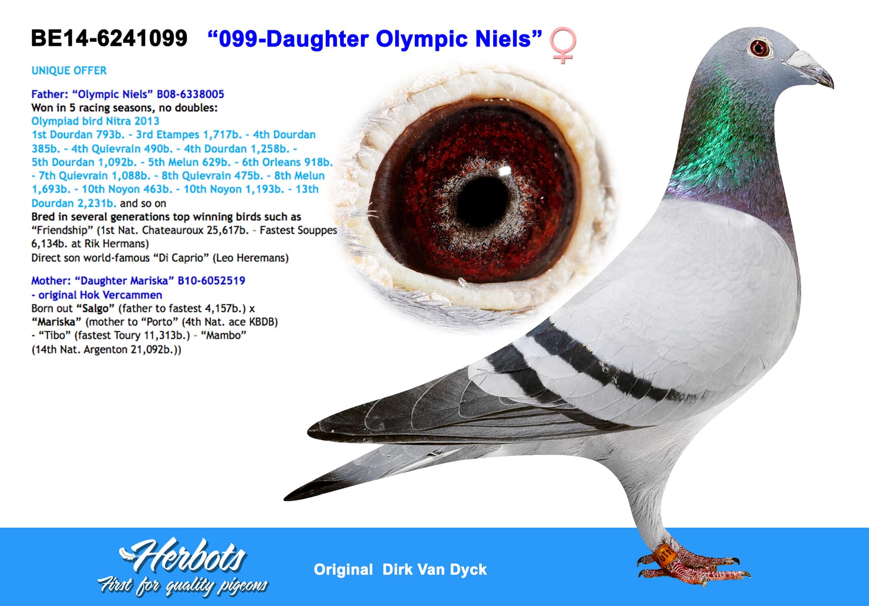“Olympic Niels” - B08-6338005 - won in 5 racing seasons, Olympiad bird Nitra 2013 - 1st Dourdan 793b. – 3rd Etampes 1,717b. – 4th Dourdan 385b. – 4th Quievrain 490b. – 4th Dourdan 1,258b. - 5th Dourdan 1,092b. – 5th Melun 629b. – 6th Orleans 918b.- 7th Quievrain 1,088b. – 8th Quievrain 475b. – 8th Melun 1,693b. – 10th Noyon 463b. – 10th Noyon 1,193b. – 13th Dourdan 2,231b. and so on