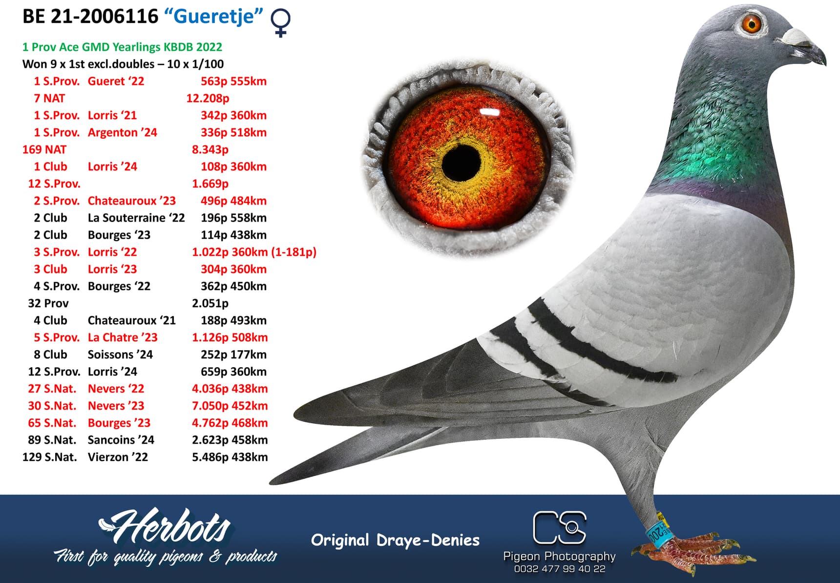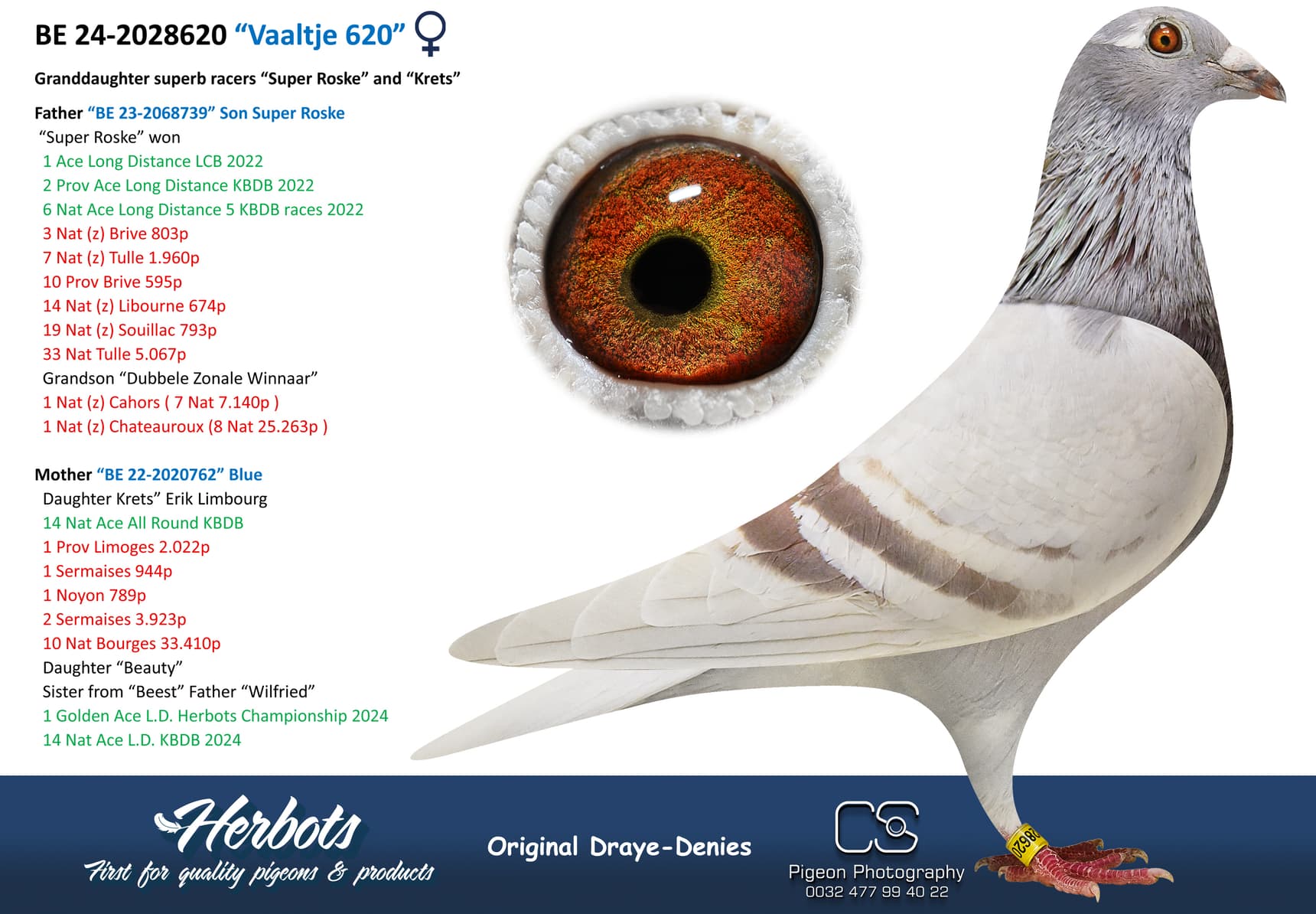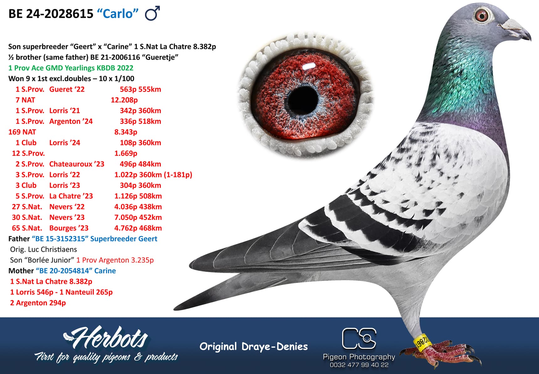 They won in 2024 with superstar “Wilfried” 1st Golden Ace Herbots Championship Long Distance – 1st Ace Pigeon Long Distance Brabantse Unie 2024 – 14 Nat Ace Pigeon Long Distance old birds KBDB 2024.