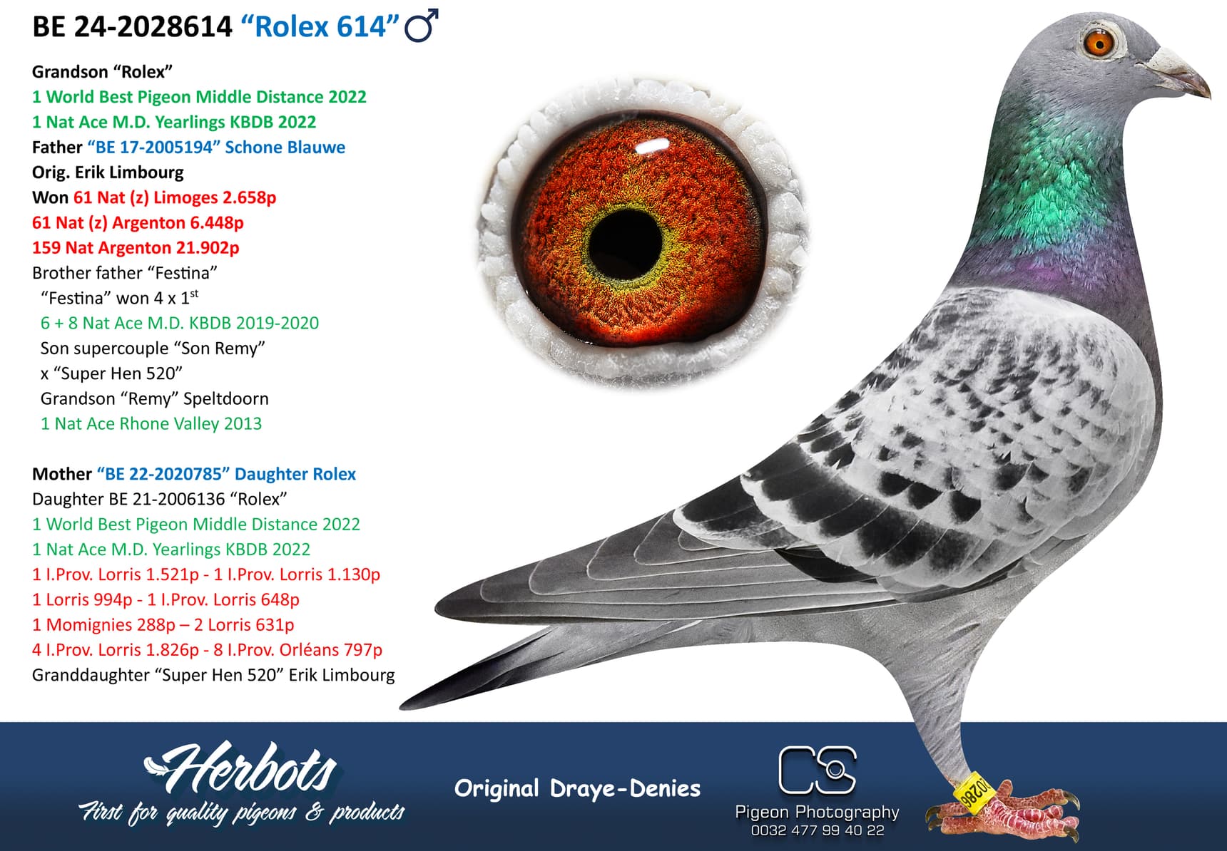They also won with “Rolex” in 2022 1st National Ace Pigeon middle distance KBDB and 1st World Best Pigeon middle distance. The most important breeding lines here come from friend of the house Erik Limbourg.