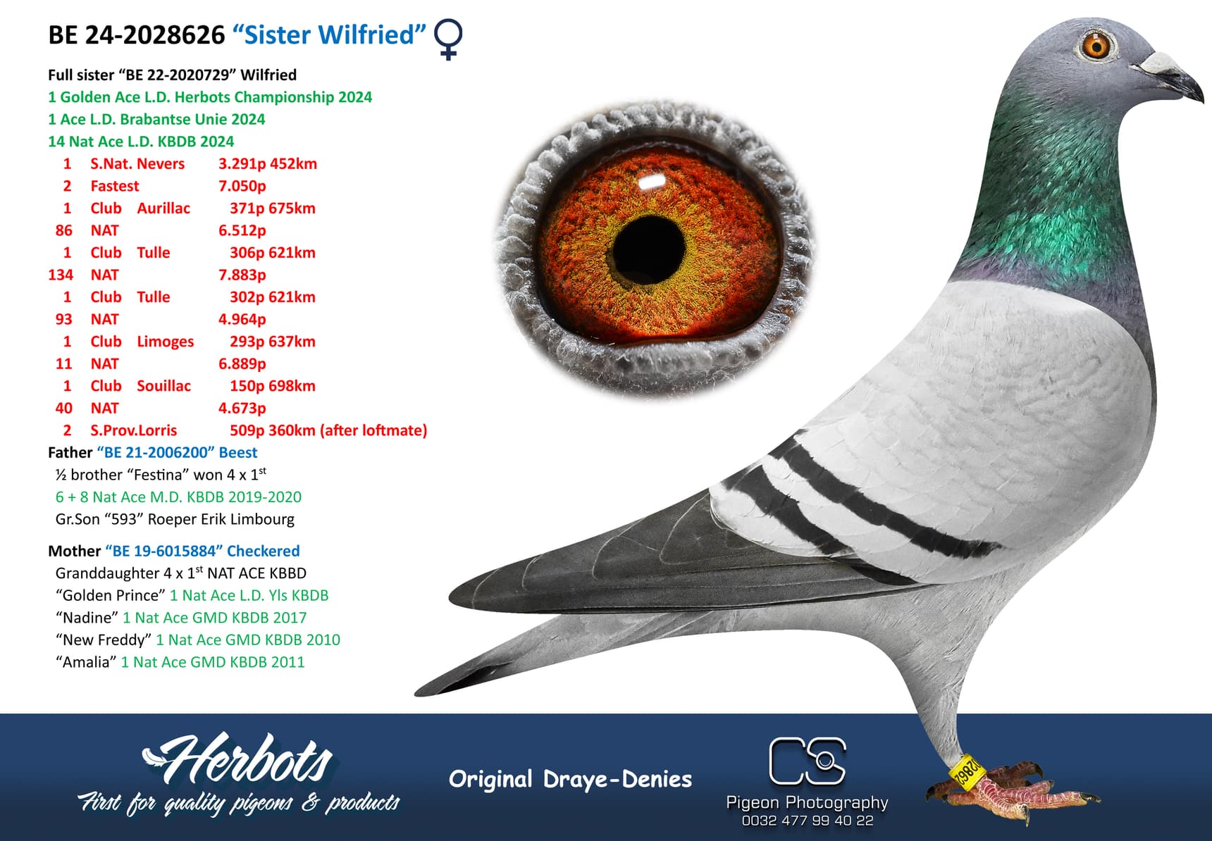 “Sister Wilfried”Sister from superstar “Wilfried” 1st Golden Ace Herbots Championship Long Distance – 1st Ace Pigeon Long Distance Brabantse Unie 2024 – 14 Nat Ace Pigeon Long Distance old birds KBDB 2024