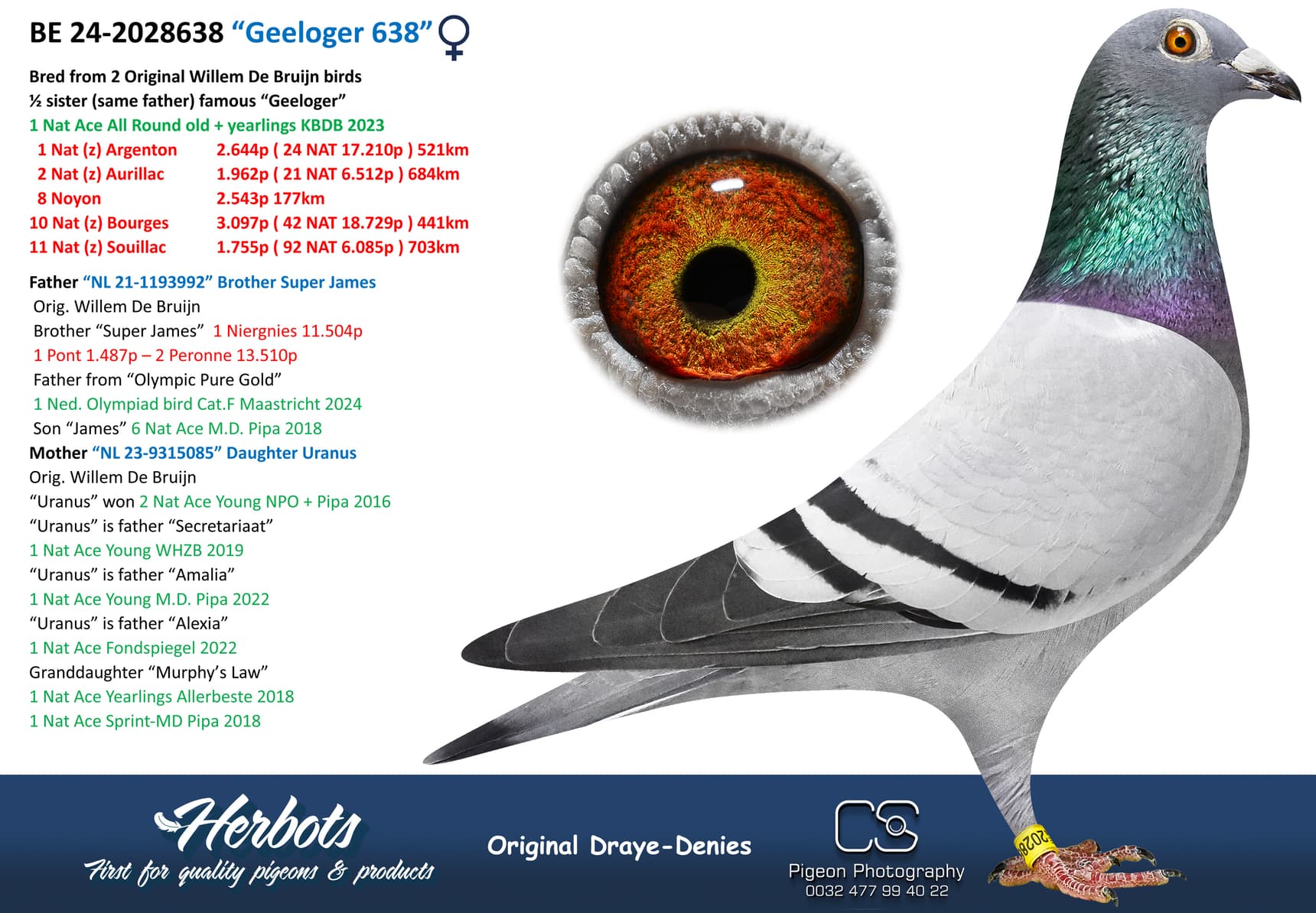 “Geeloger 638” 100% Willem De Bruijn and ½ sister famous “Geeloger” 1 Nat Ace All Round old + yls KBDB 2023