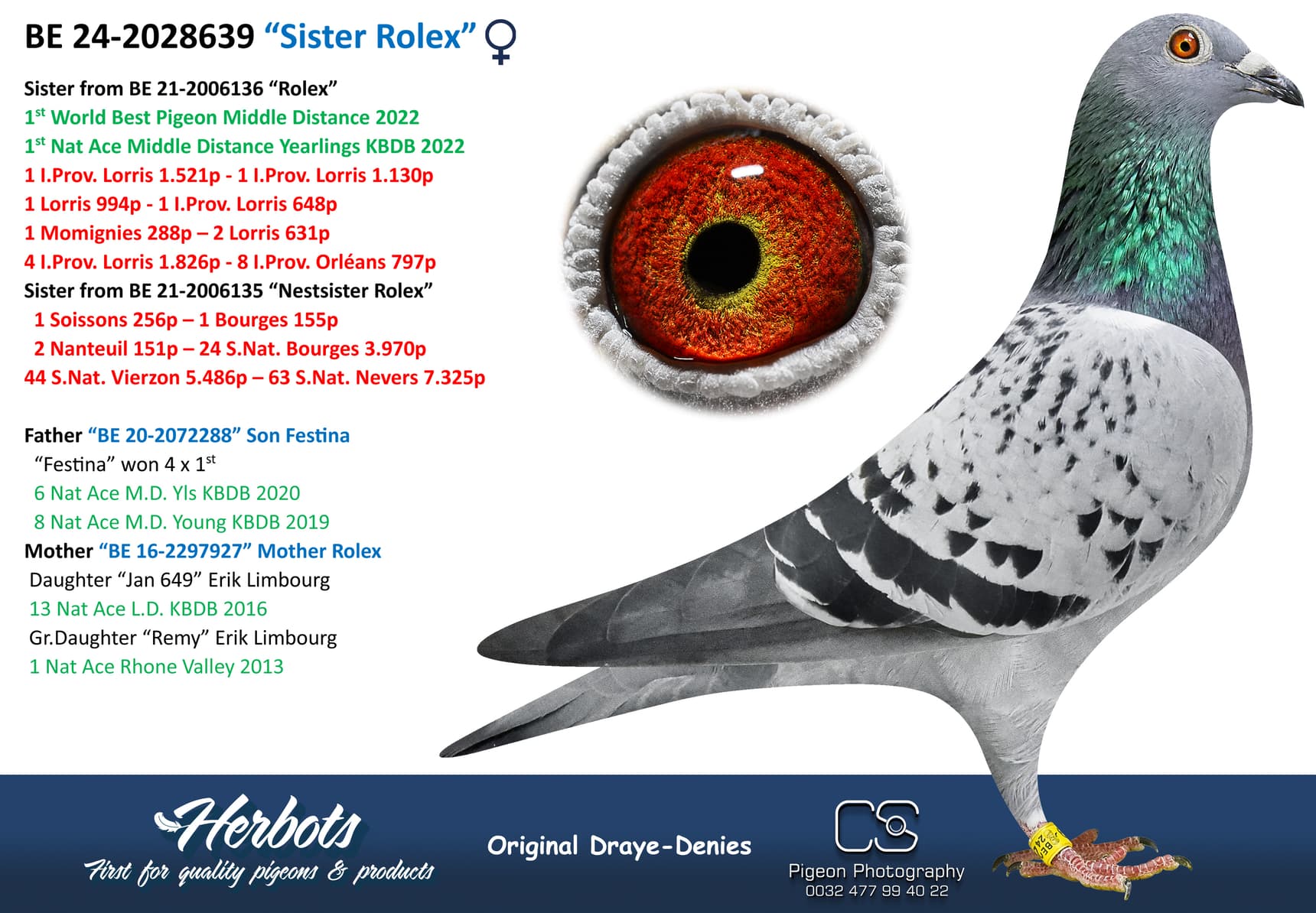 “Sister Rolex” is full sister “Rolex” 1st National Ace Pigeon middle distance KBDB 2022 and 1st World Best Pigeon middle distance 2022