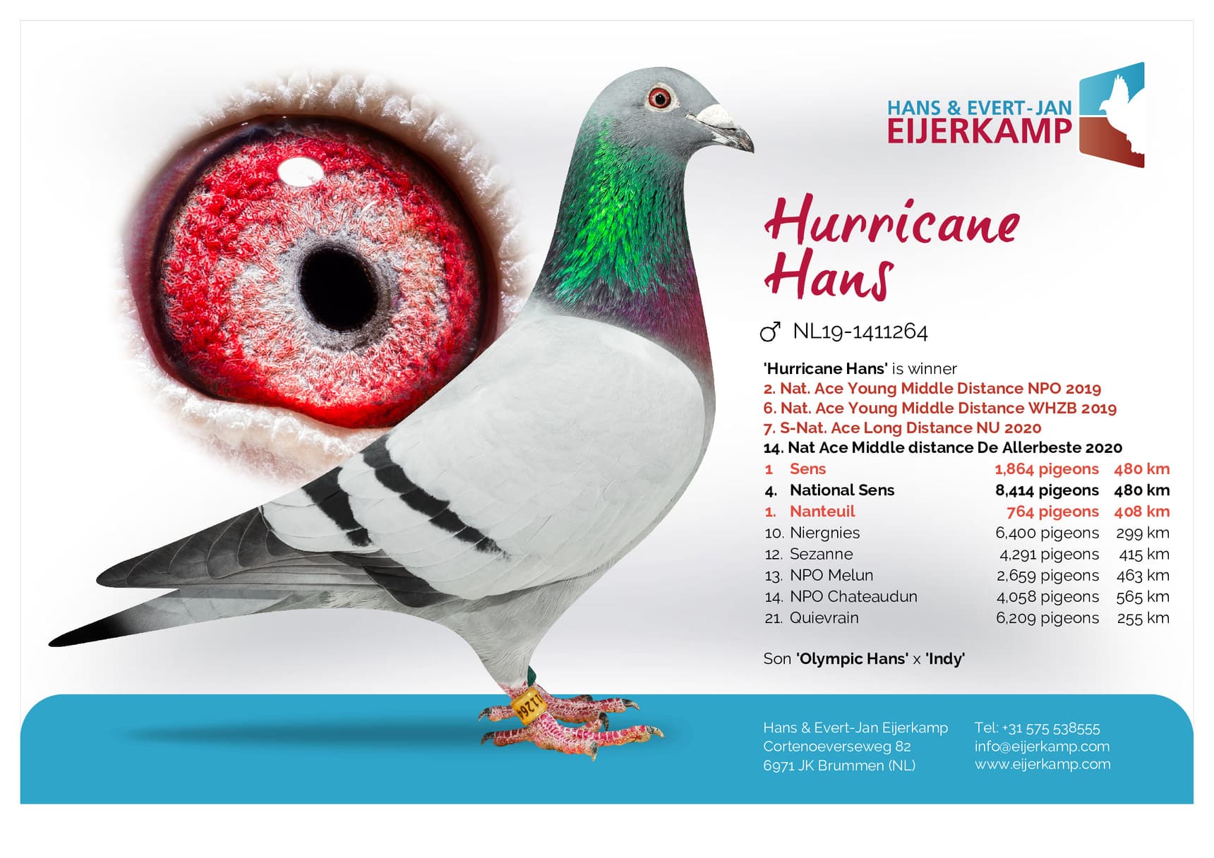 Direct son “Olympic Hans” (Olympiad bird Allround Brussels ’17 – 3rd Nat. ace Fond WHZB) x “Indy” (3rd Nat. ace allround hens WHZB ’15)