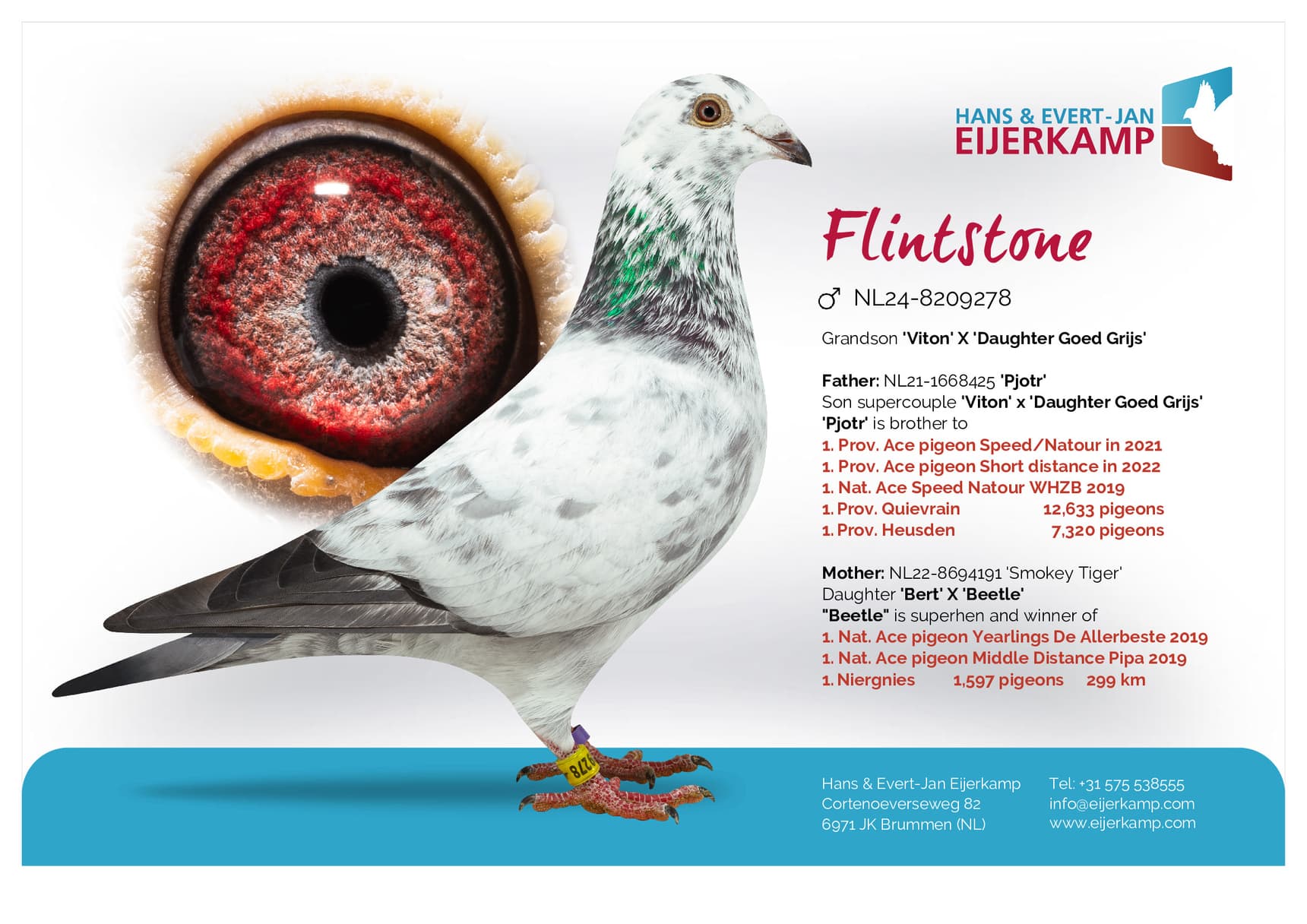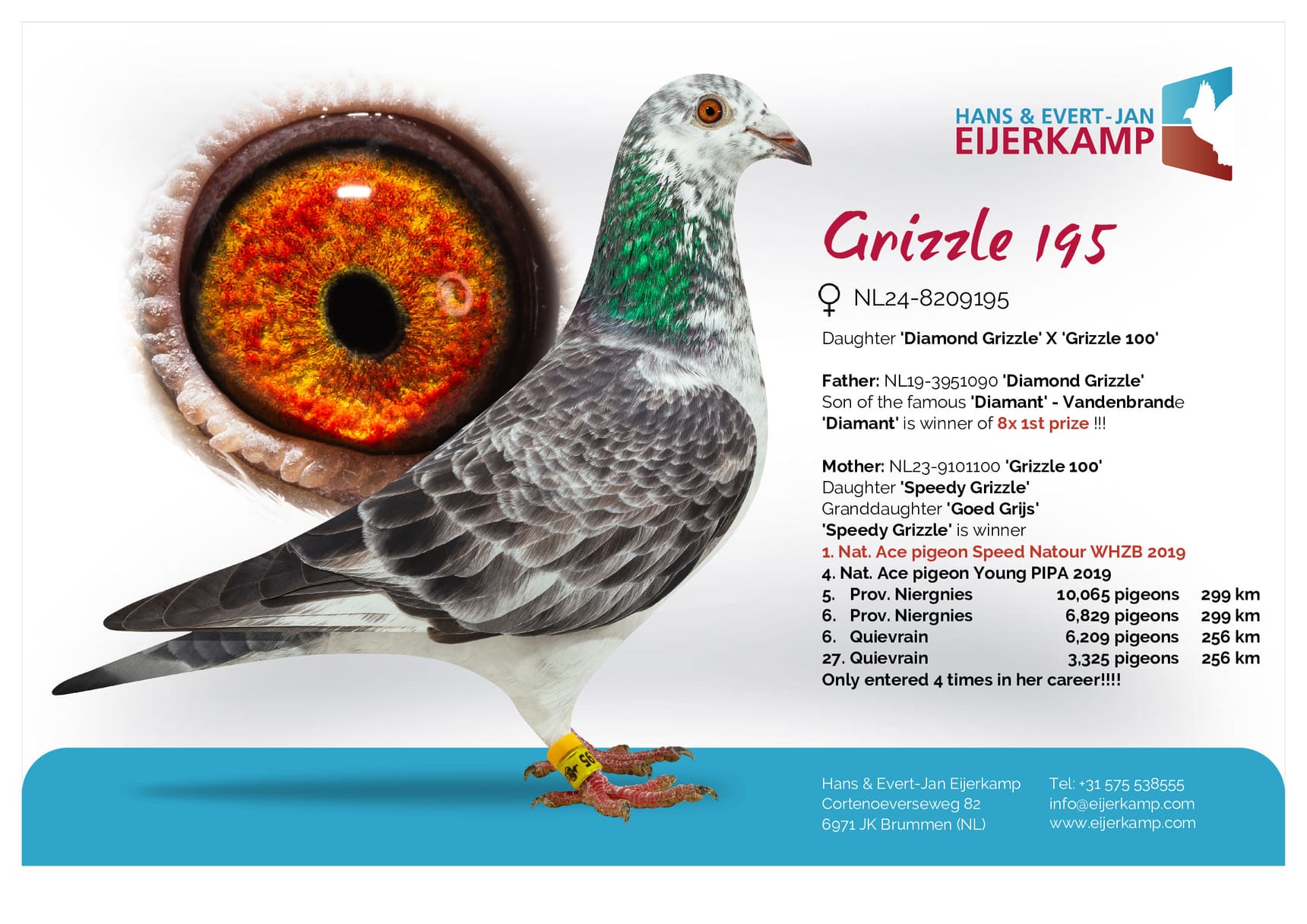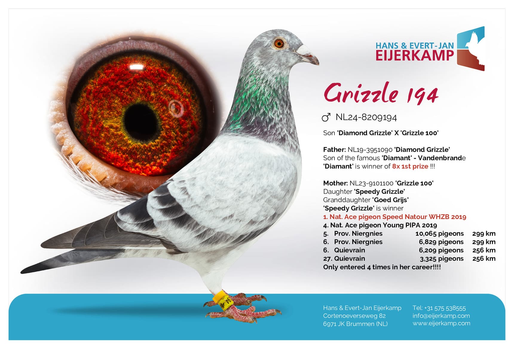 Daughter “Bor” (2nd, 6th, 18th, 28th,31st and 34th Prov. winner) x “Rachel” (won: 1st Prov. Weert 11,059b. – 23rd Prov. Gennep 12,820b. – 21st Weert 5,785b. – 39th Arlon 7,113b.)