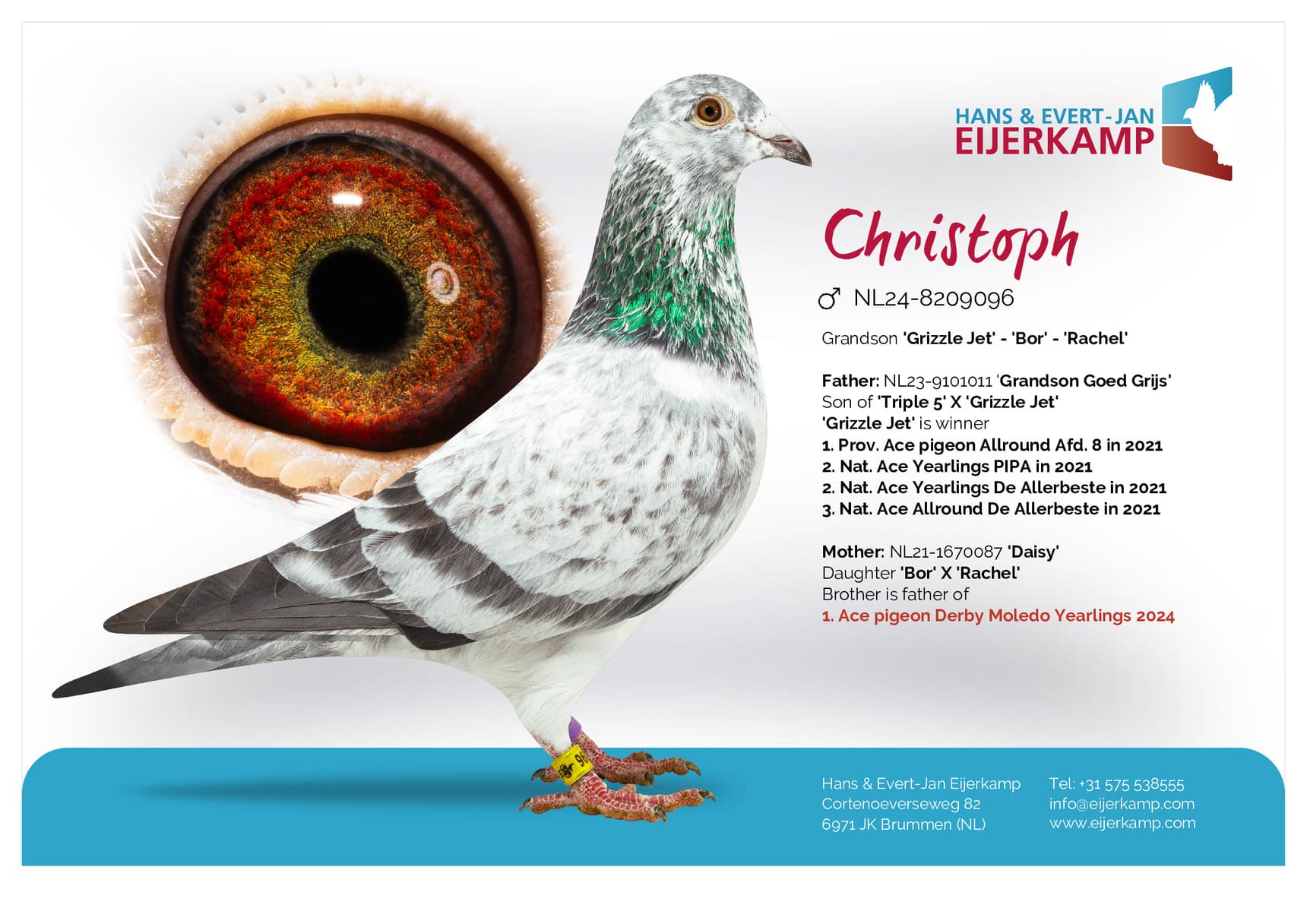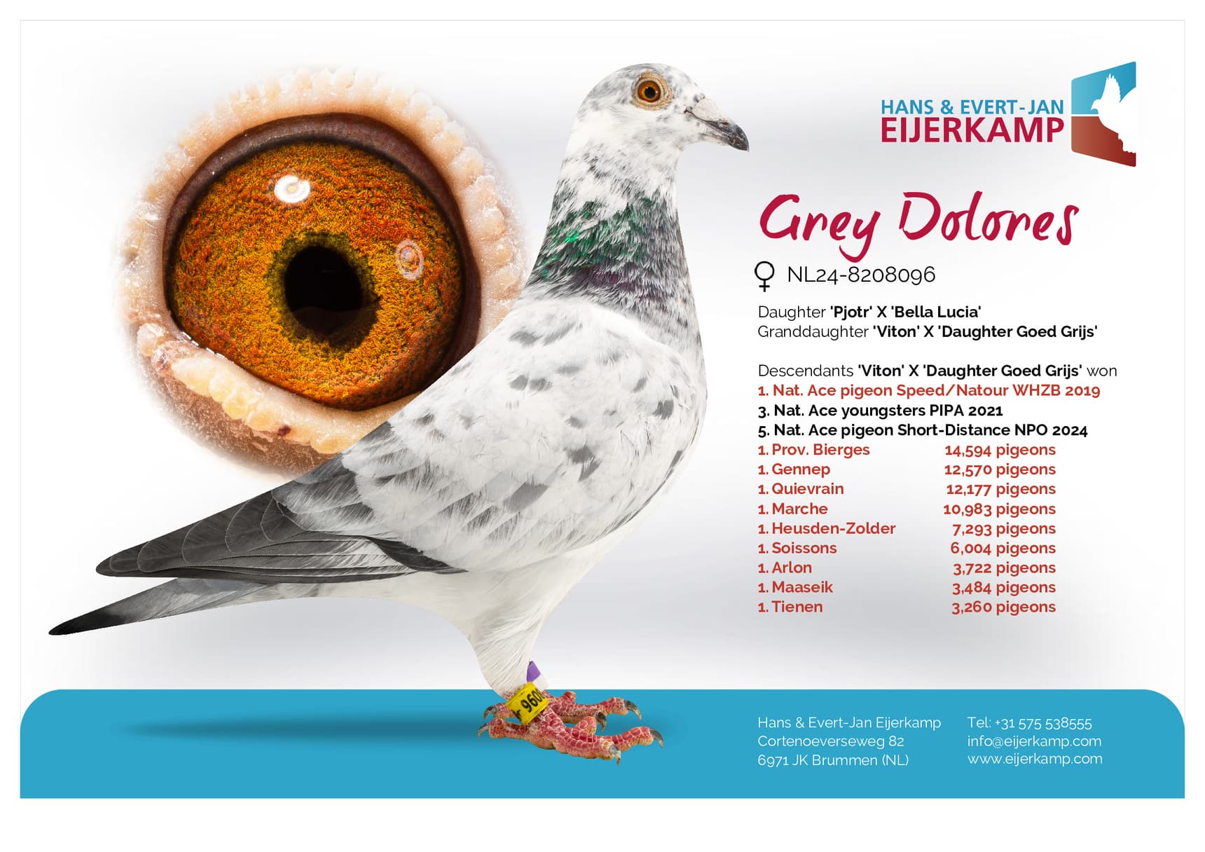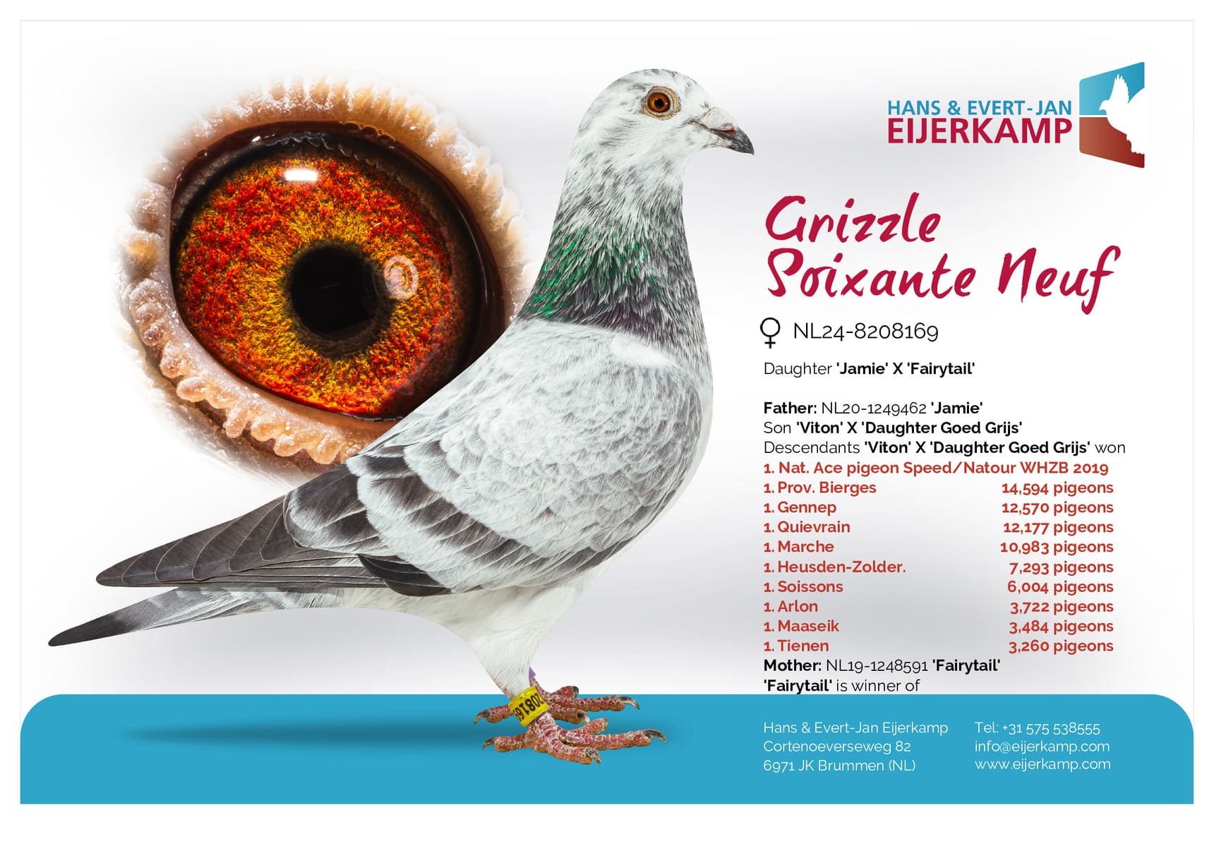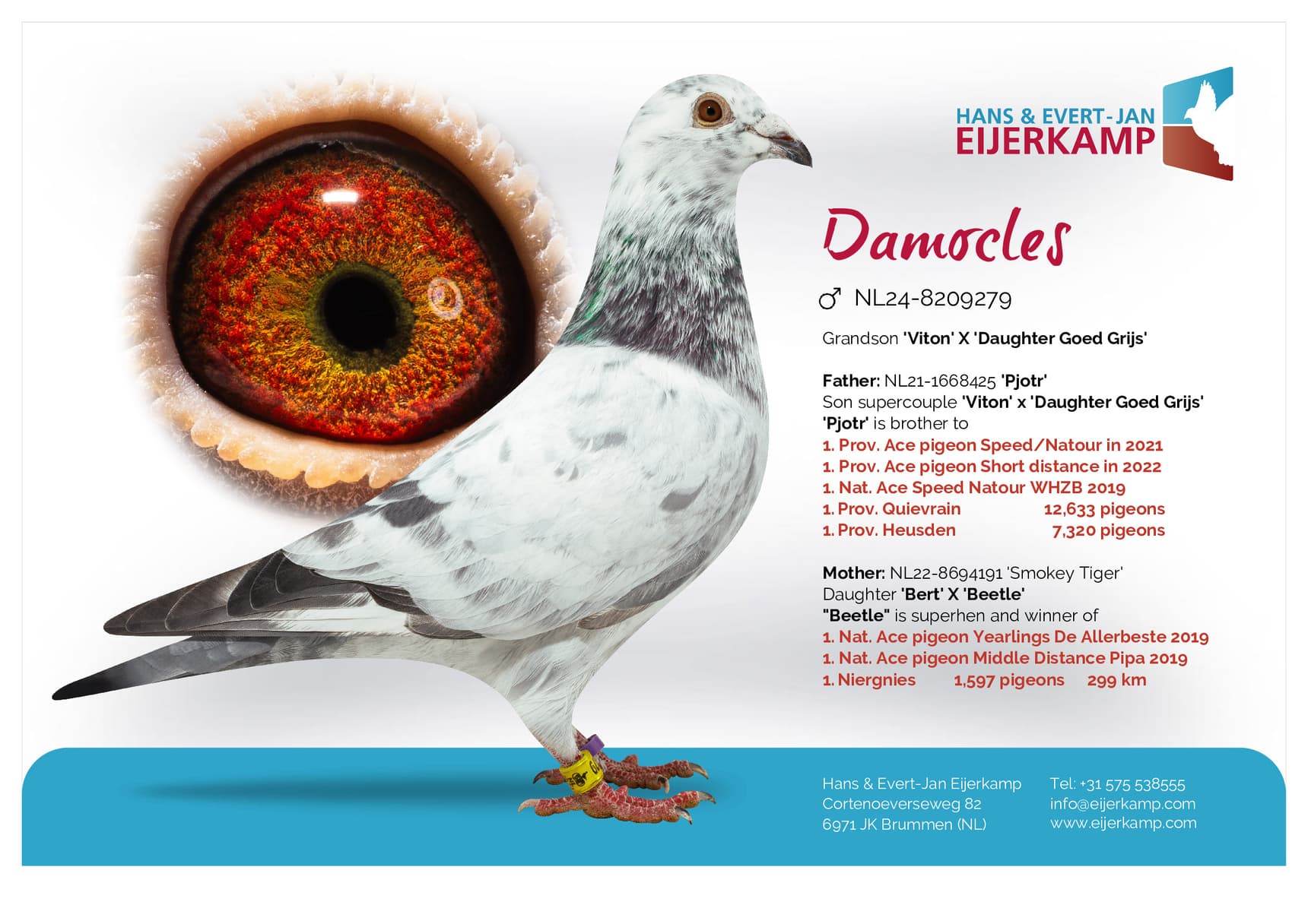 Daughter “Bor” (2nd, 6th, 18th, 28th,31st and 34th Prov. winner) x “Rachel” (won: 1st Prov. Weert 11,059b. – 23rd Prov. Gennep 12,820b. – 21st Weert 5,785b. – 39th Arlon 7,113b.)