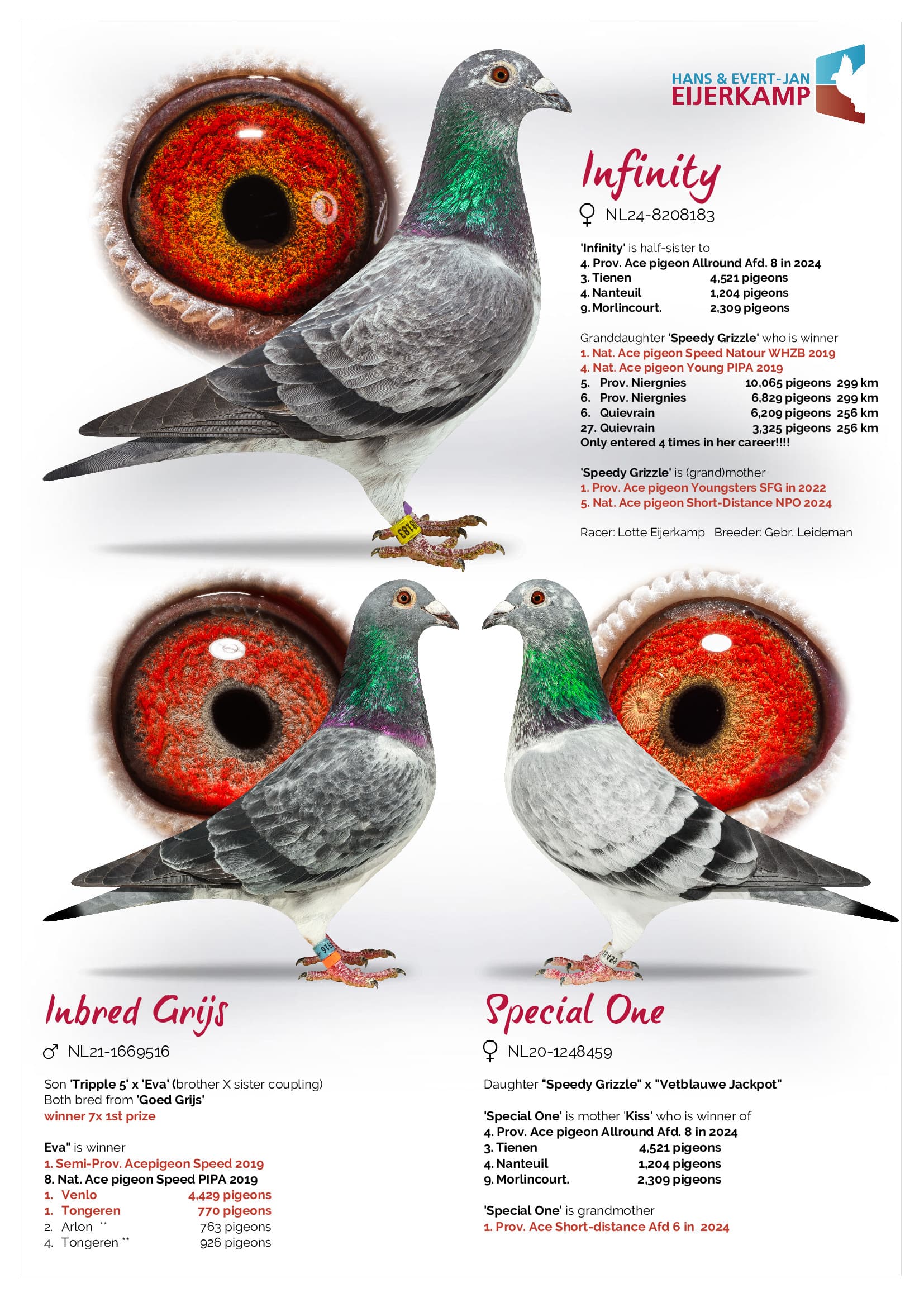 Son out “brother x sister” pairing “Triple 5” (father to 3 x 1st) x “Eva” (1st S-prov. ae short distance ’19 - 8th Nat. ace Short Distance Pipa Ranking 19 – 1st Venlo 4,429b. – 1st Tongeren 770b. – and so on)