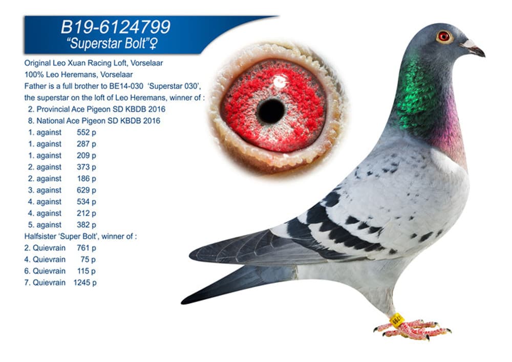 Born out “Brother 030” (full brother to “030”, winner of 4 x 1st prize – 2nd prov. and 8th National ace KBDB short distance 016) x “Ultimate Bolt” (mother to “Super Bolt”, 5 x Top-10 position – double granddaughter “Gebroken Poot” x “Bourgeske”)