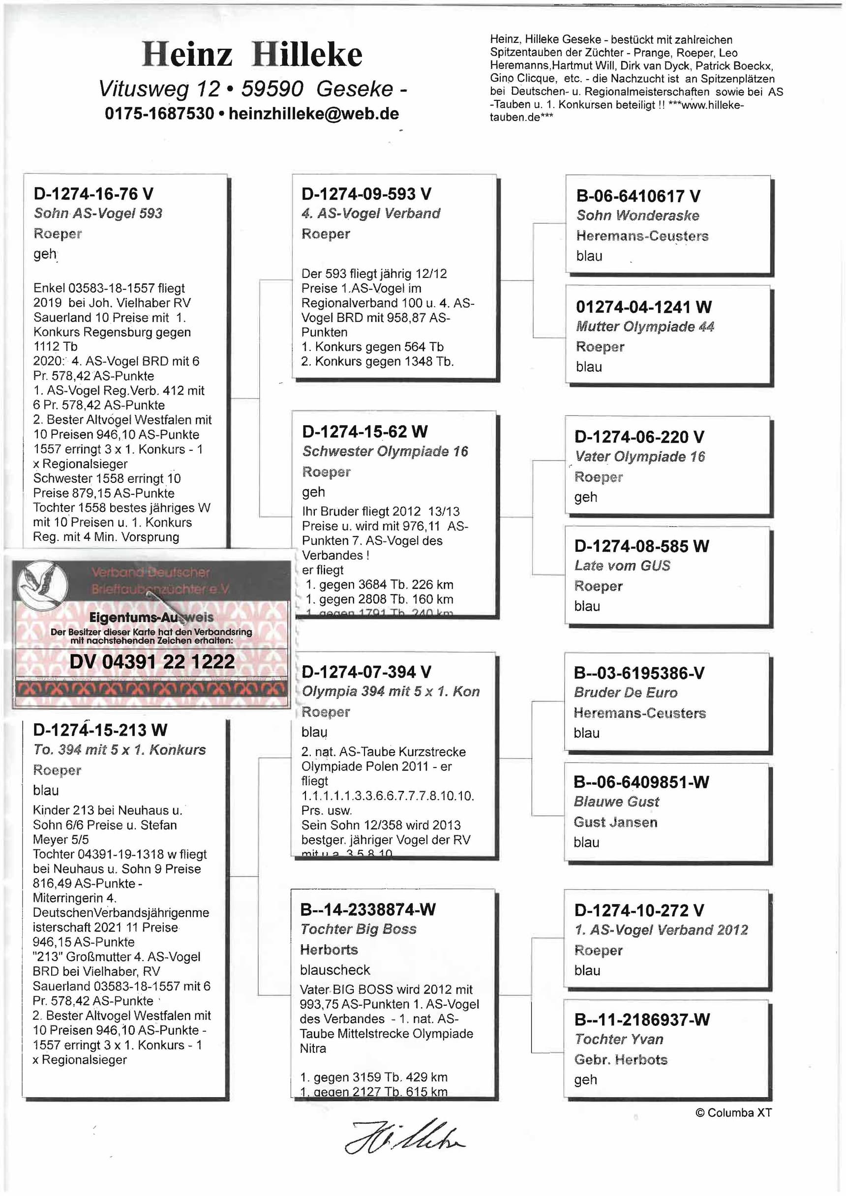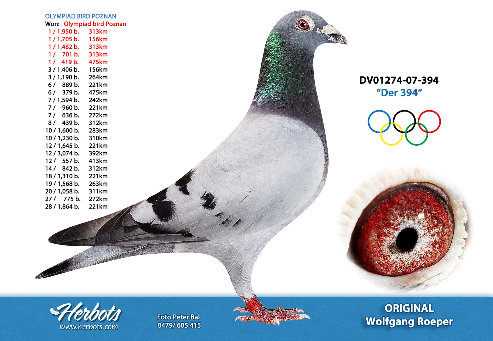 Full sister “Der 16”, winner of: 7th and 14th Nat. ace BRD (2012 and 2013) – Olympiad bird Nitra ‘13 - 1st/1,791b. – 1st/2,808b. – 1st/3,684b. and so on