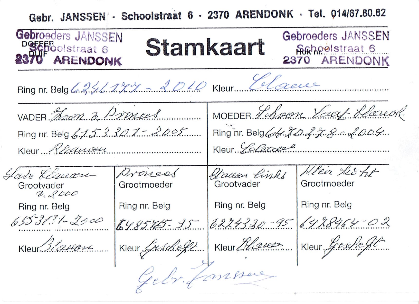 Direct daughter  of “Zoon van Prinses” x “Schoon Laat Blauw”