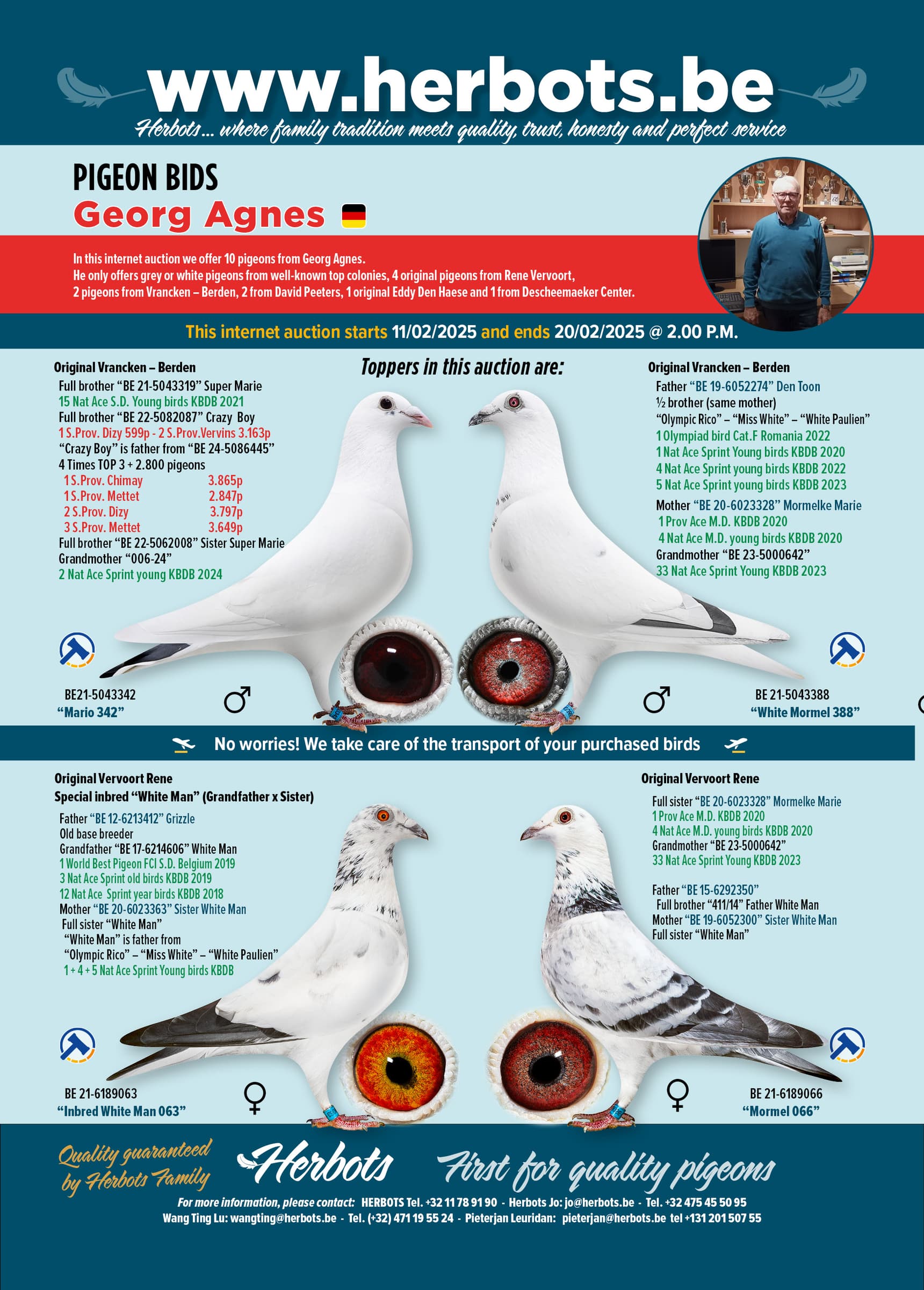 In this internet auction we offer 9 pigeons from Georg Agnes. He only offers grey or white pigeons from well-known top colonies,
