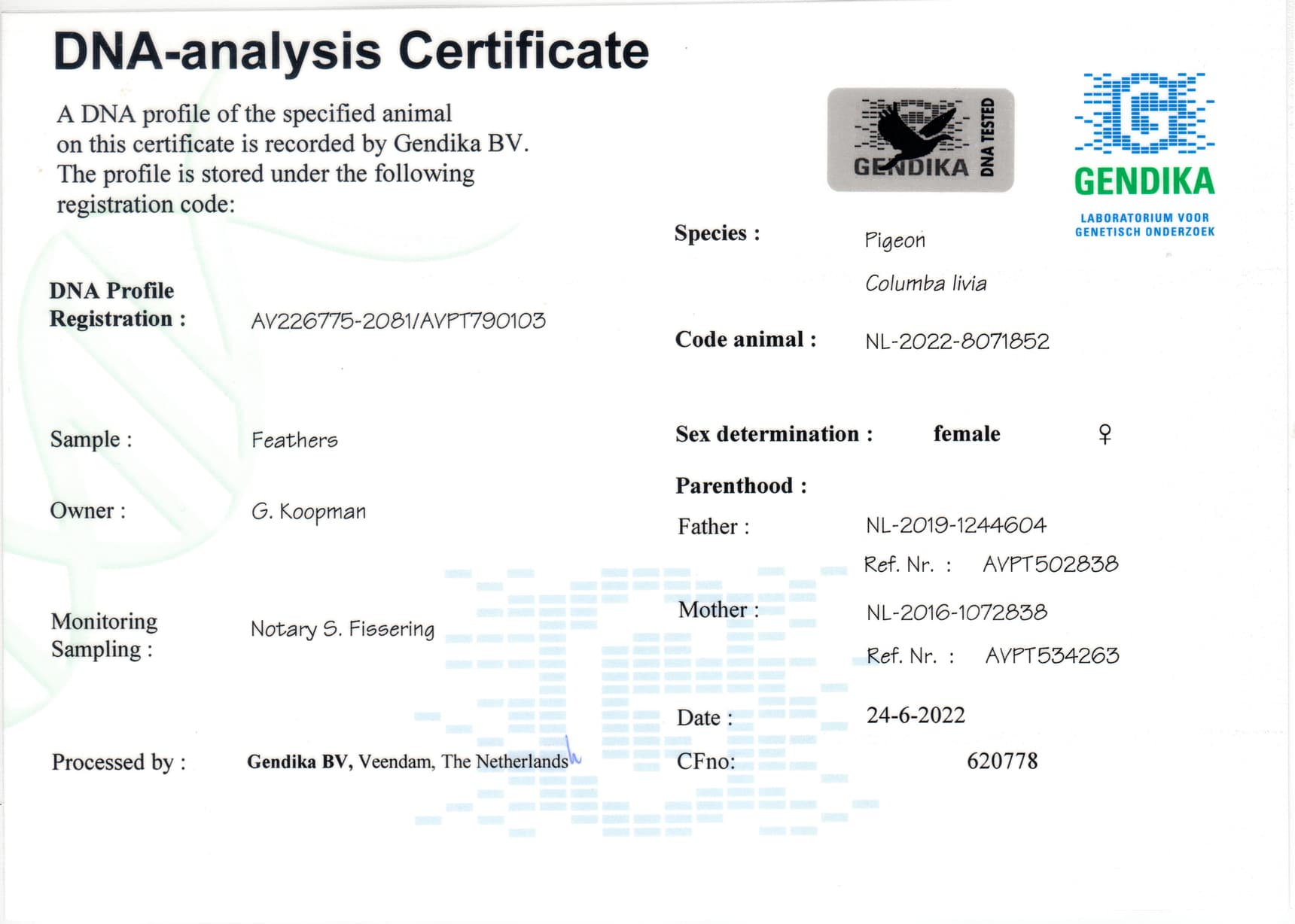 Is a half-sister to “Bert Junior” (1st NPO Chateaudun - 9th NPO Chateauroux) - “Alawa” (3rd Rethel 4,692b., 5th Bourges 3,734b. - 6th Chateauroux 2,566b.) - “Believer” (1st Nat. ace Fondspiegel 2011-2013 Cat. E/F) “Fahsai”: 1st NPO Sens 4,237b. - “Sifan” (fastest Sens Sector 10-11 against 10,701b.)