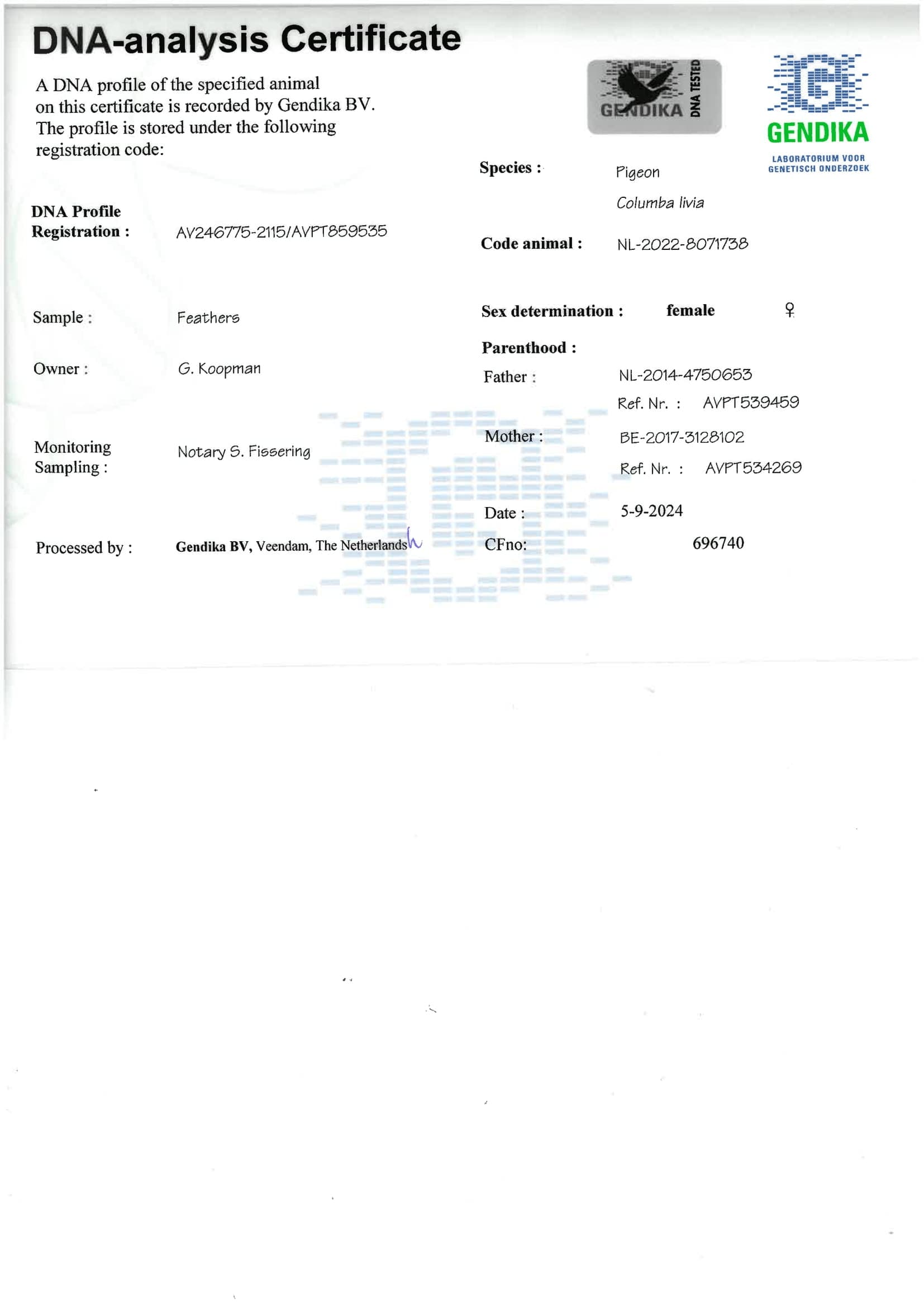 Born out “Asduif 807” (1st Ace “Belgische Verstandhouding” 2013 - 5th Nat. St. Vincent 3,786b. - 30rd Nat. Montauban 6,772b.) x “Sister Barcelona Duivin” (Is a full sister to “Barcelona Duivin”, 21st and 56th Nat. Barcelona and mother to “Magic Barcelona” (1st Nat. and 2nd Internat. Barcelona))