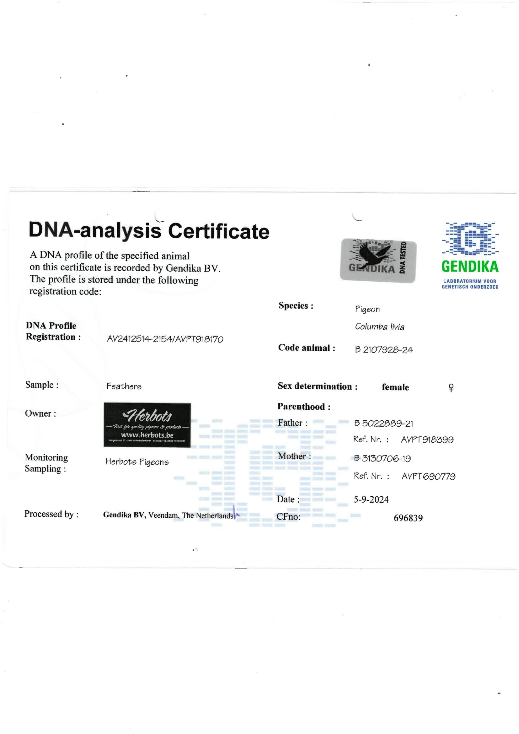 1st Best Pigeon in Belgium on MD Old birds 2023 (5 races 0.7118 *)