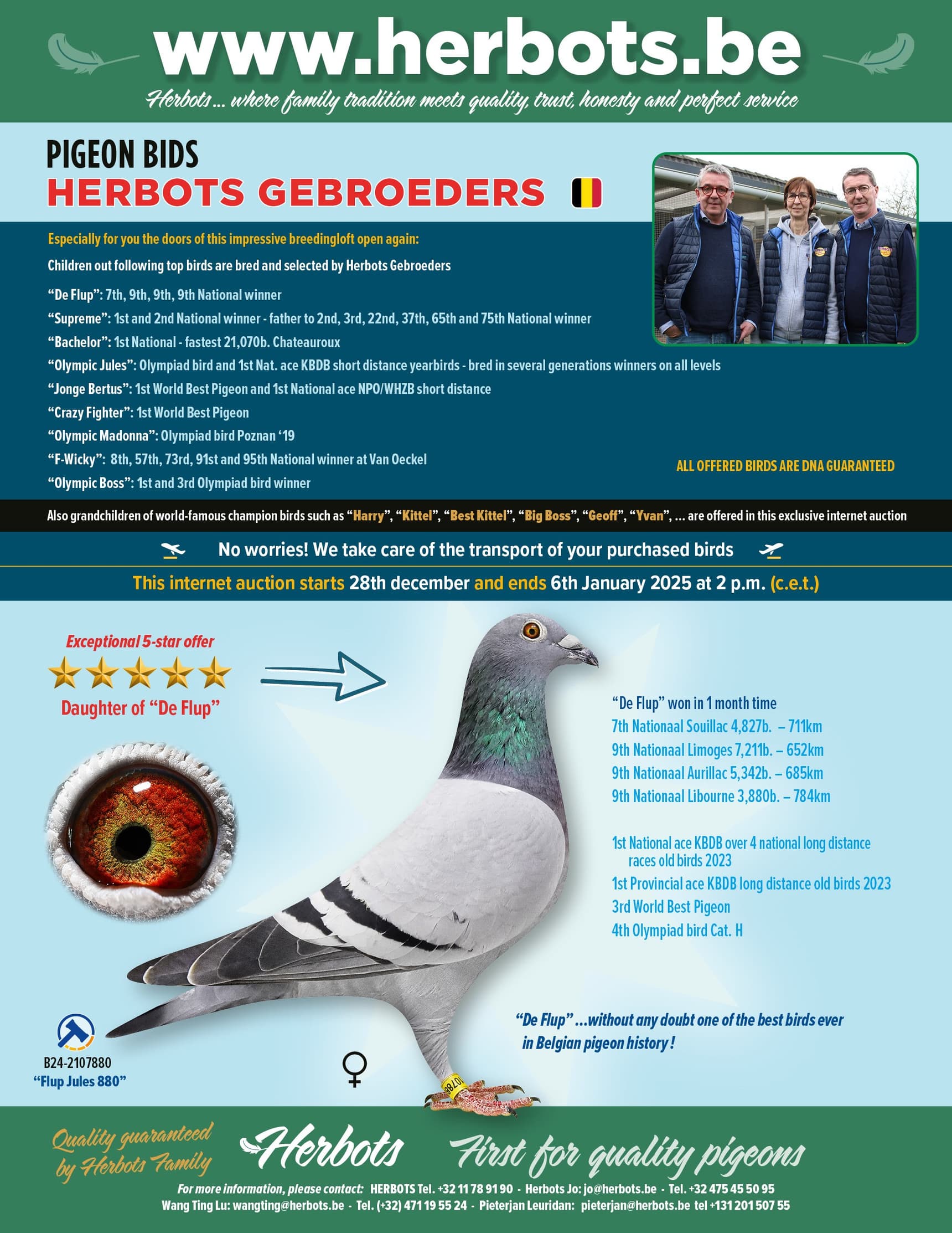 pigeon bids herbots gebroeders january 2025 - including exceptional 5-star offer - "daughter de flup"