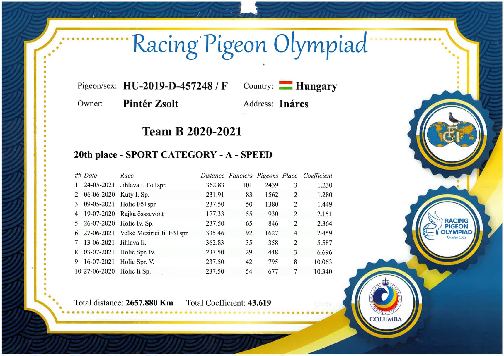 Won: 1st national Olympic Ace Pigeon categorie a.( short distance)