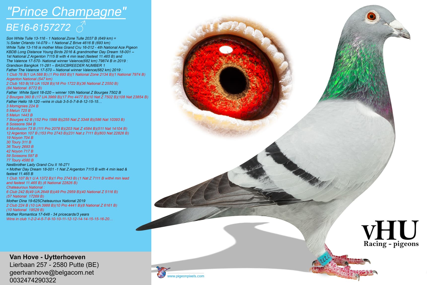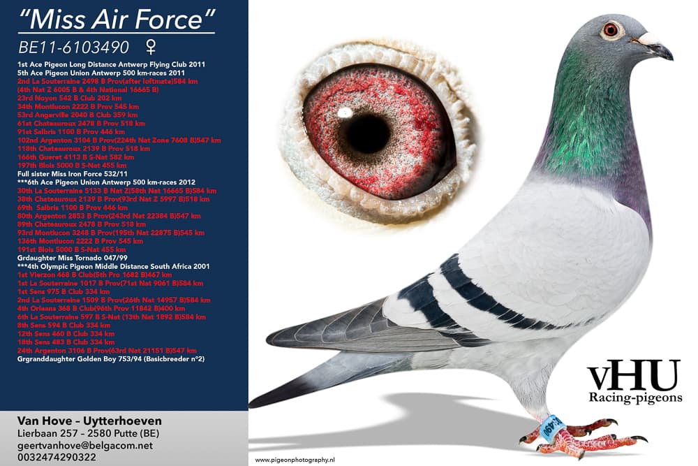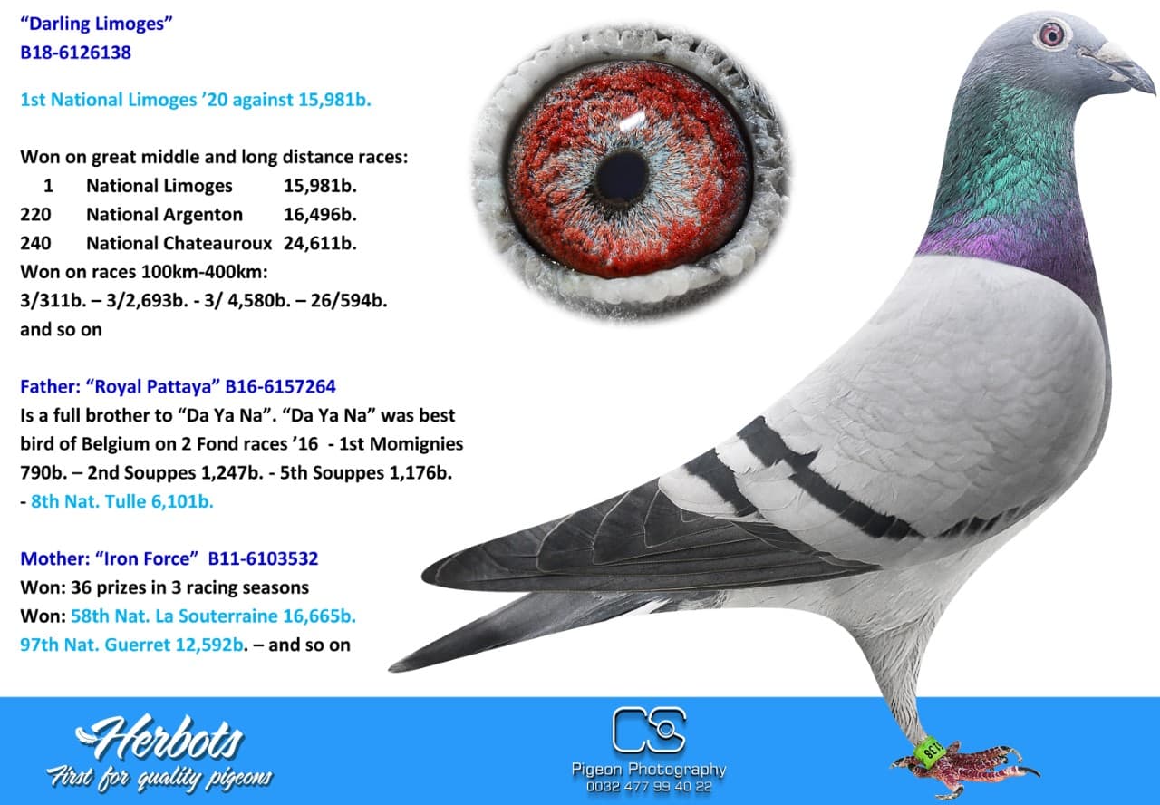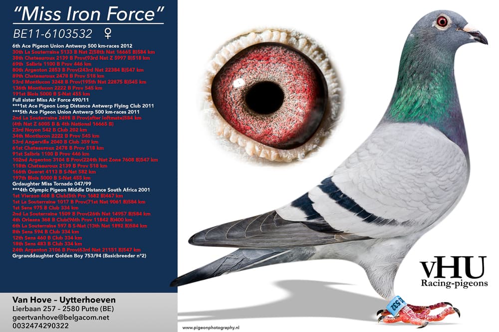 Direct daughter “Royal Pattaya” (Full brother to "Da Ya Na", winner of Best bird of Belgium on 2 Fond races ’16 – 1st Momignies 790b. – 2nd Souppes 1,247b. – 5th Souppes 1,176b. – 8th Nat. Tulle 6,101b. and so on ) x “Iron Force” (58th Nat. La Souterraine 16,665b. – 97th Nat. Guerret 12,592b. – and so on)