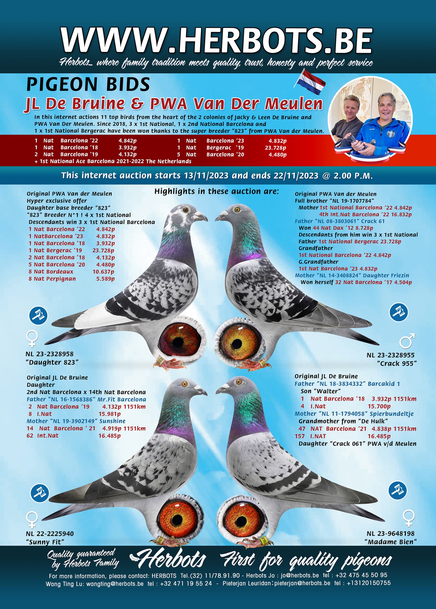 In this internet actions 11 top birds from the heart of the 2 colonies of Jacky & Leen De Bruine and PWA Van Der Meulen. Since 2018, 3 x 1st National, 1 x 2nd National Barcelona and 1 x 1st National Bergerac have been won thanks to the super breeder “823” from PWA Van der Meulen.