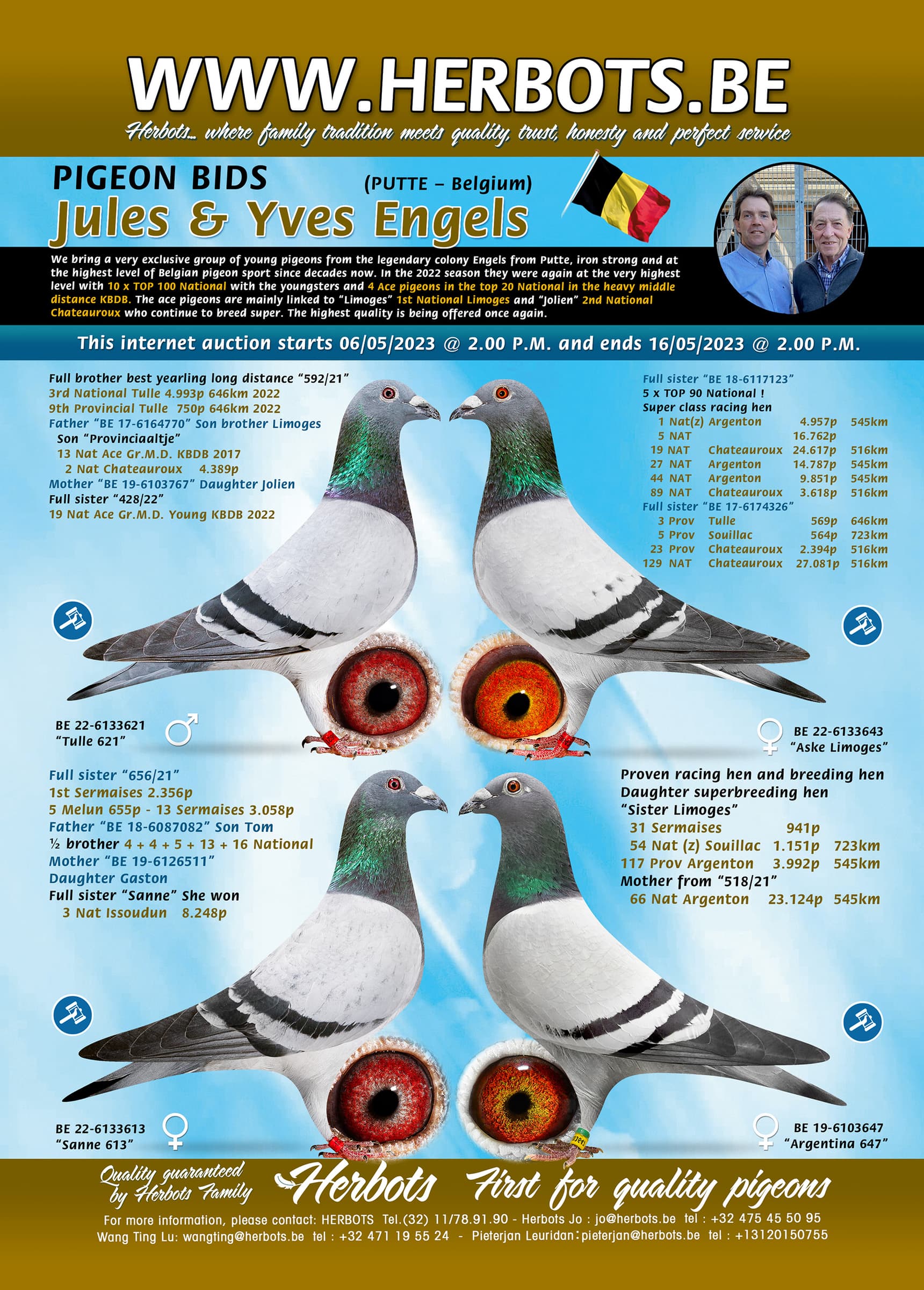 We bring a very exclusive group of young pigeons from the legendary colony Engels from Putte, iron strong and at the highest level of Belgian pigeon sport since decades now. In the 2022 season they were again at the very highest level with 10 x TOP 100 National with the youngsters and 4 Ace pigeons in the top 20 National in the heavy middle distance KBDB. The ace pigeons are mainly linked to “Limoges” 1st National Limoges and “Jolien” 2nd National Chateauroux who continue to breed super. The highest quality is being offered once again.