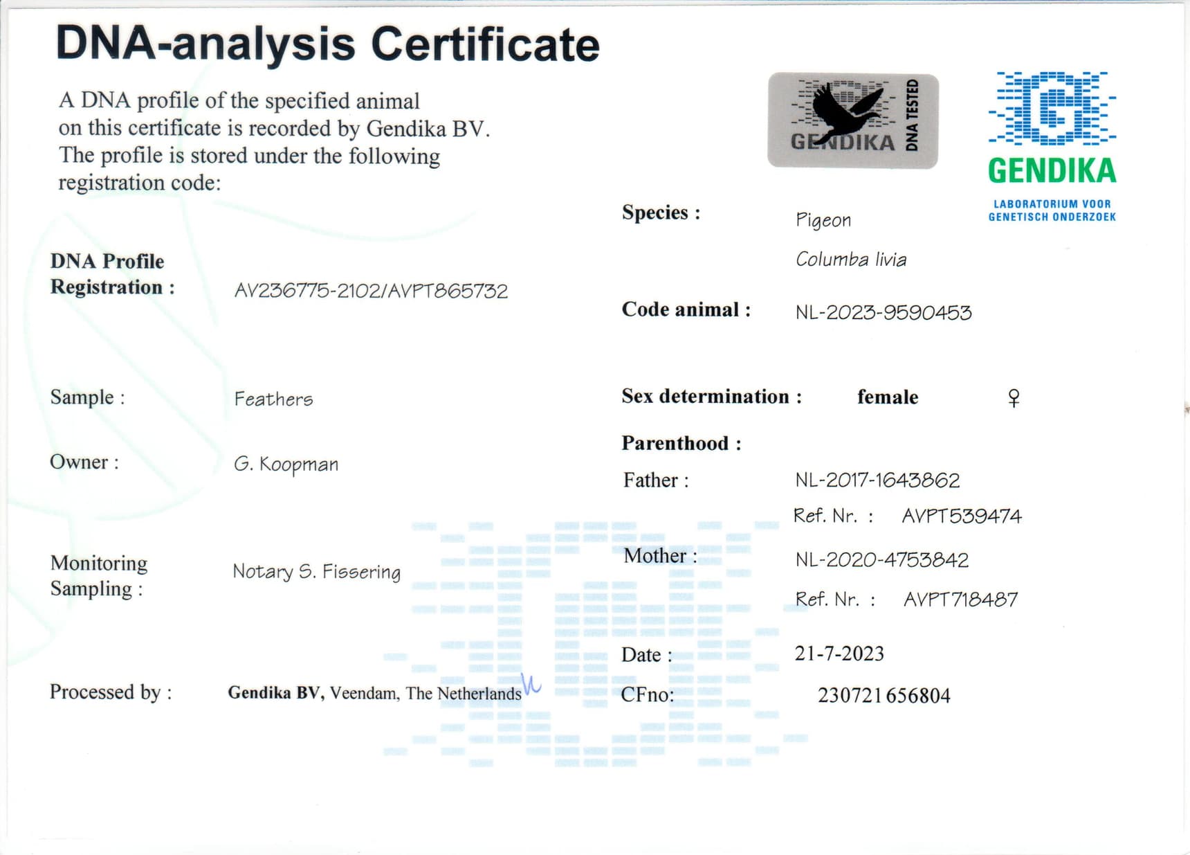Born out “Golden Capri” (direct son “Di Caprio” Heremans) x “Goudband” ” (mother to “Manu” , “Amadi”. Direct daughter “Cassius” x “Gicara”)