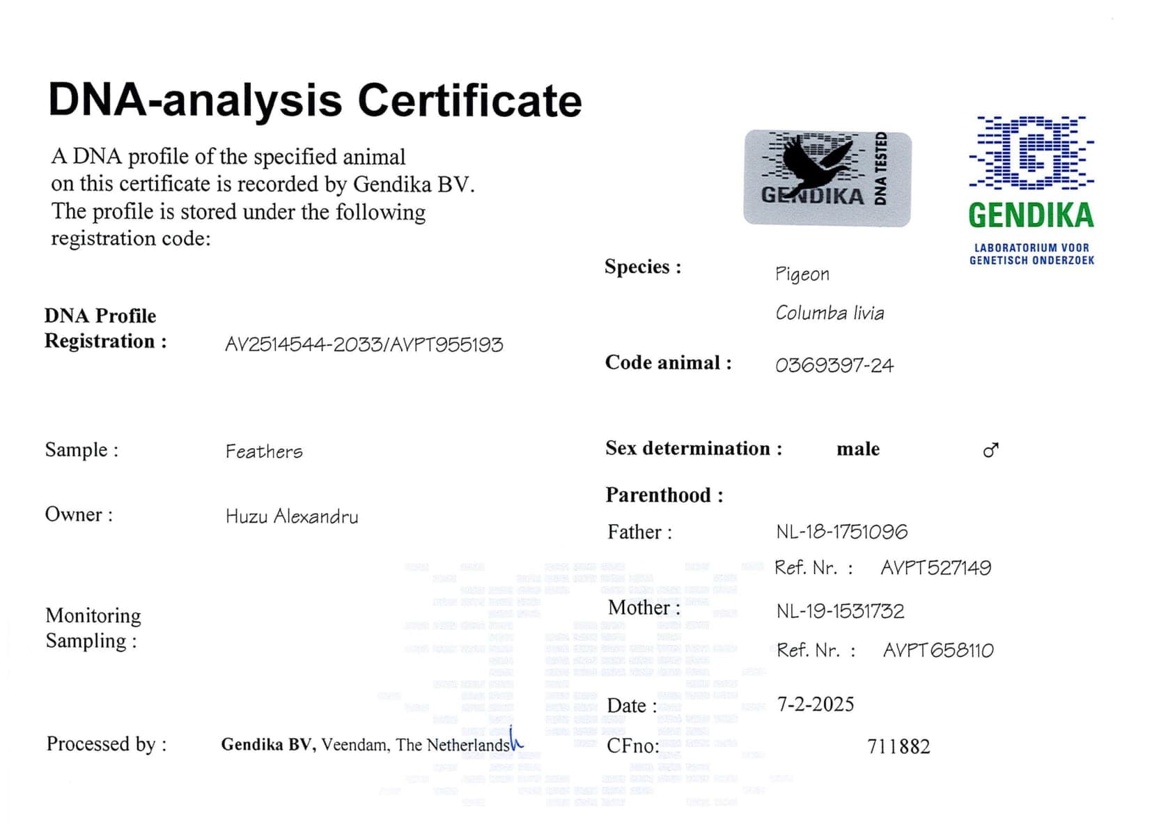 Born out “Milos” (all info see above) x “Chanel Messi” (daughter champion bird “Messi”)