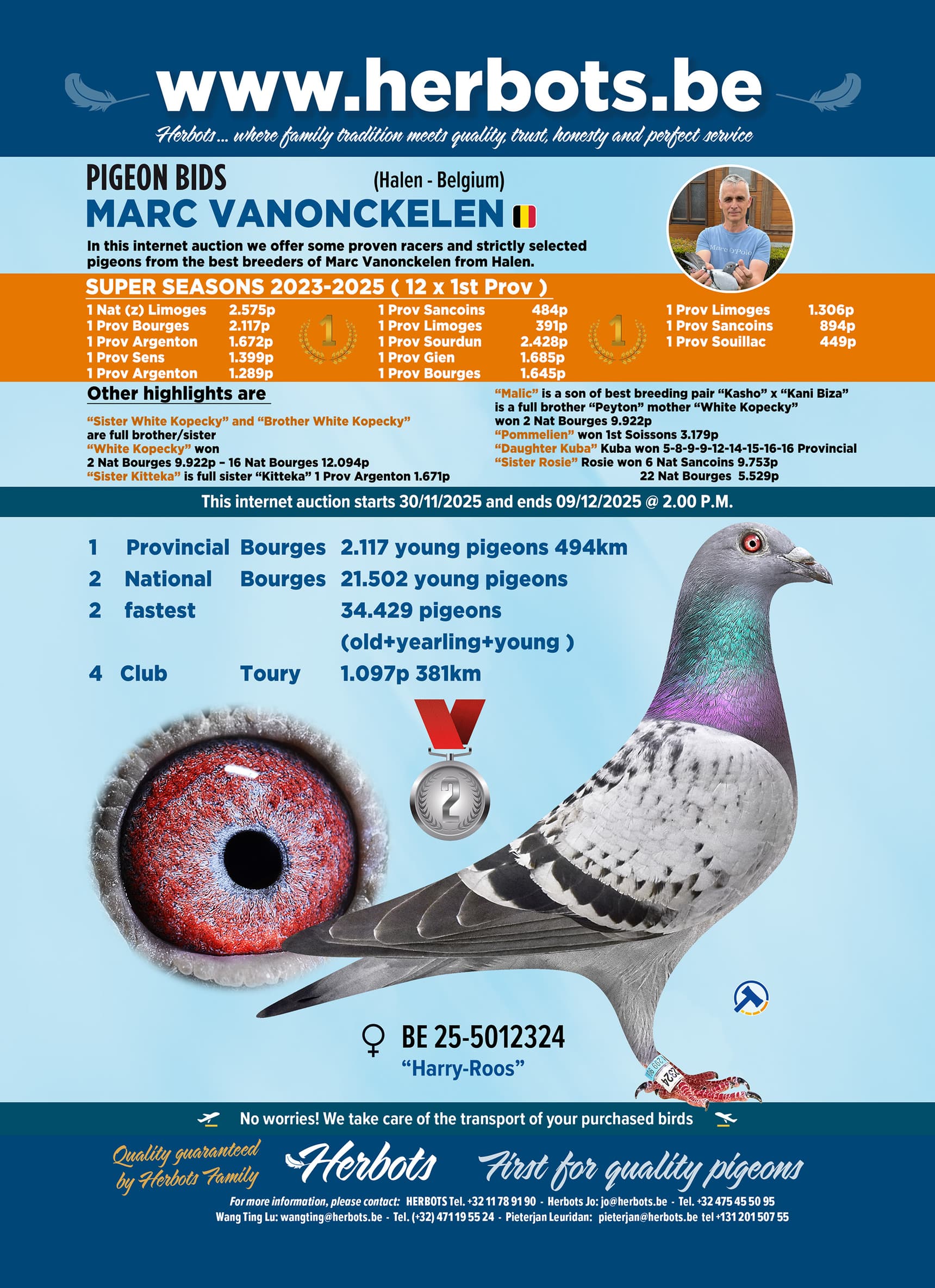 In this special auction superstar "Harry-Roos" 2nd NATIONAL BOURGES WINNER 21.502 YOUNG PIGEONS 2025