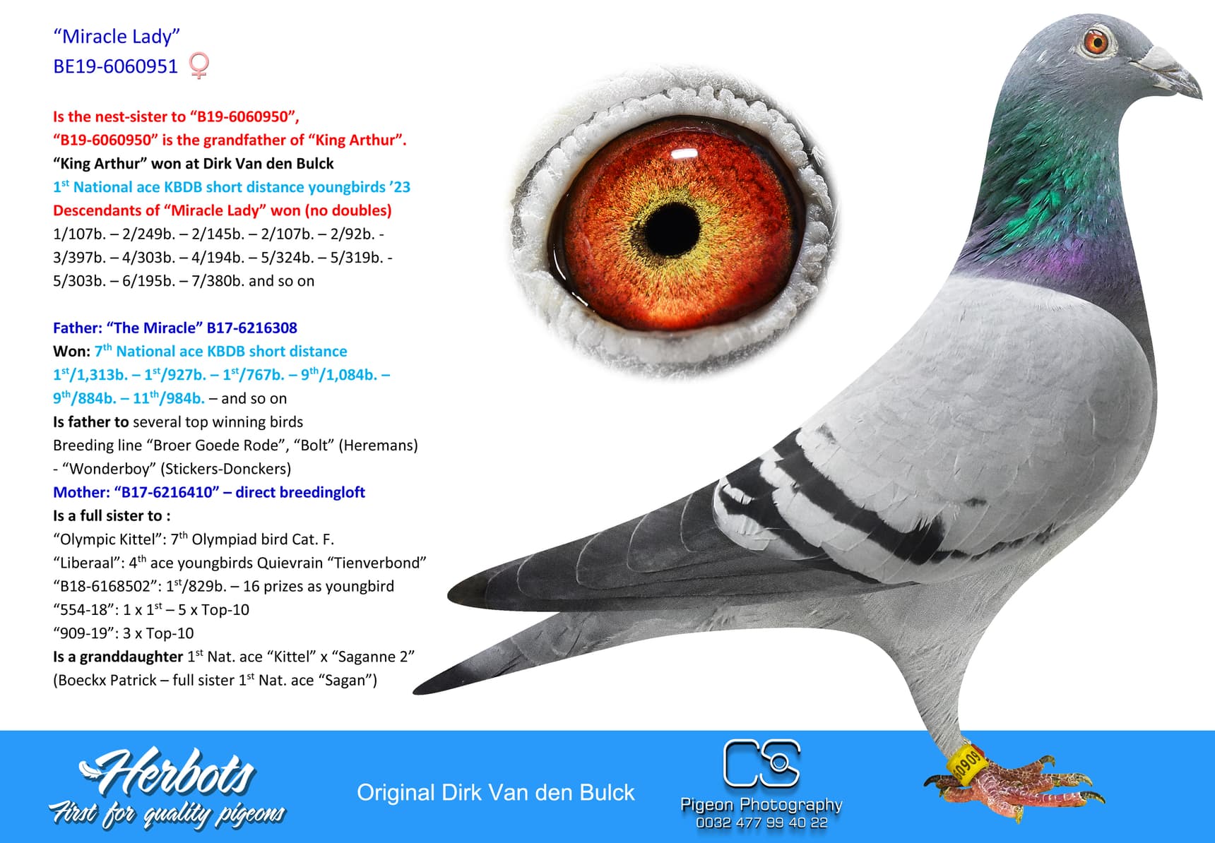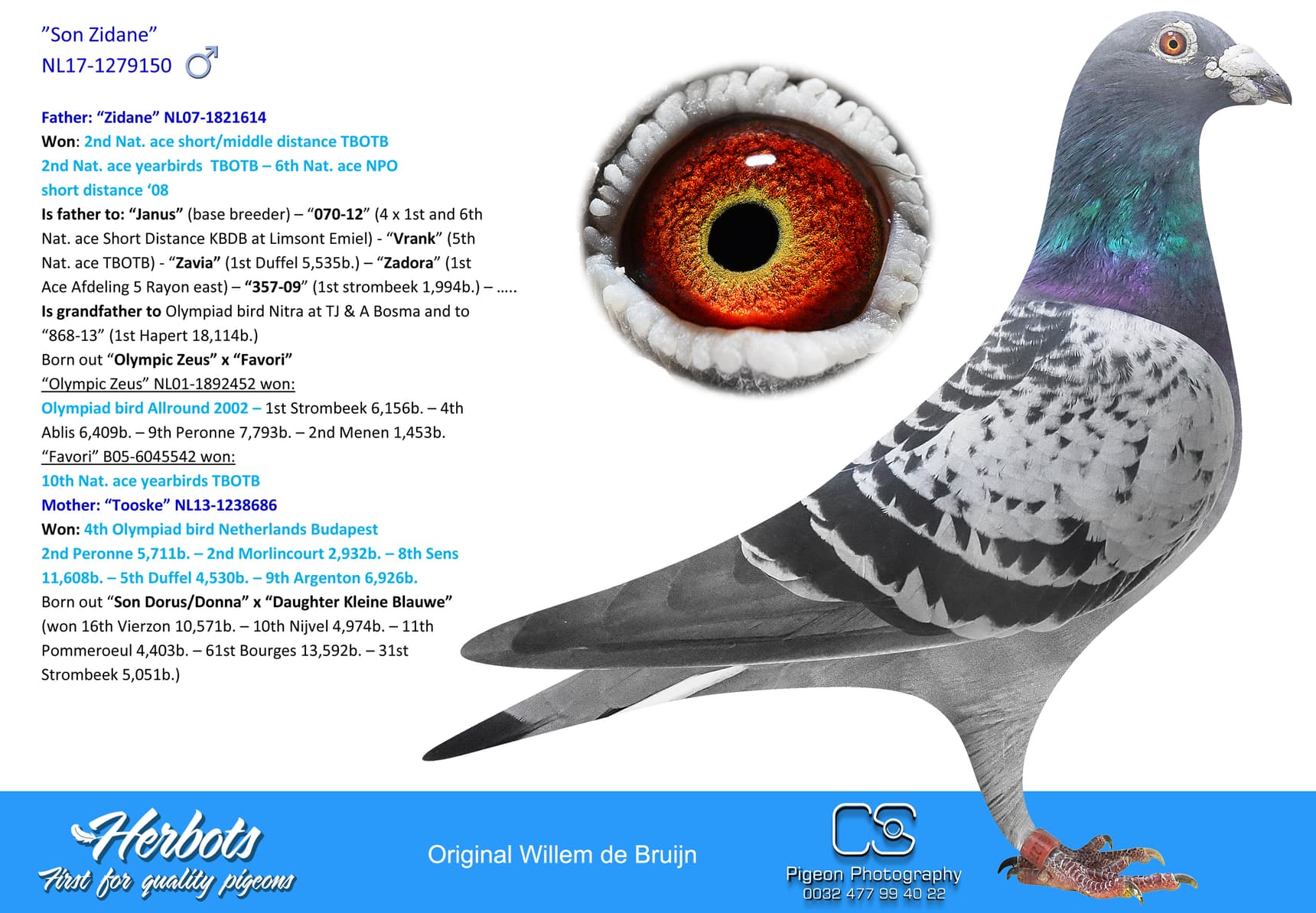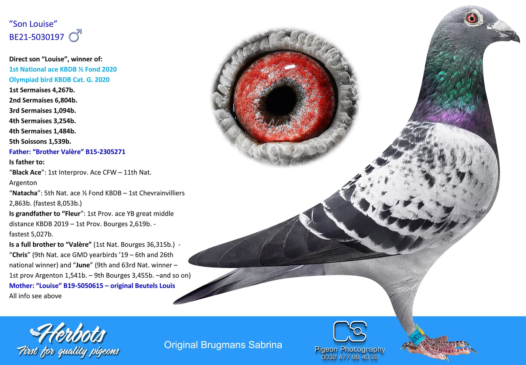Is a full brother to “Valère” (1st Nat. Bourges 36,315b.) - “Chris” (9th Nat. ace GMD yearbirds ’19 – 6th and 26th national winner) and “June” (9th and 63rd Nat. winner – 1st prov Argenton 1,541b. – 9th Bourges 3,455b. –and so on)
