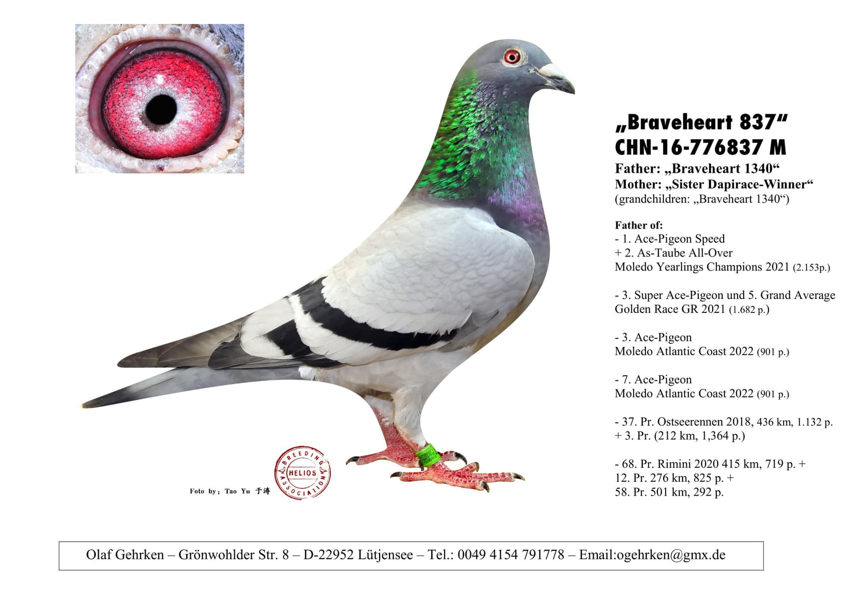 Born out “Braveheart 1340” (original Vanhoute W.) x “Sister Dapi Race Winner” (full sister to 1st prize OLR Dapirace 1,088b. = grandson “Braveheart 1340”)