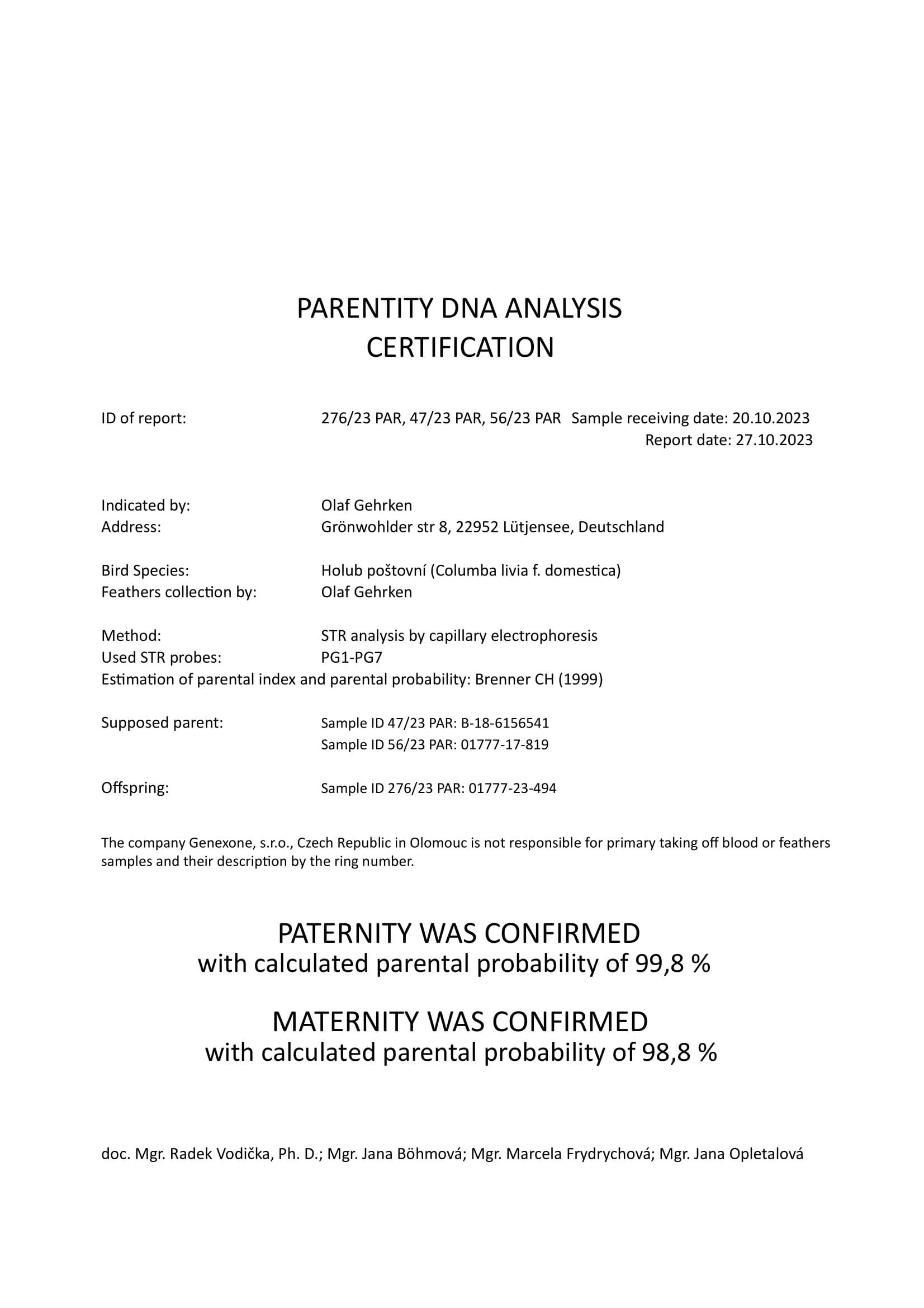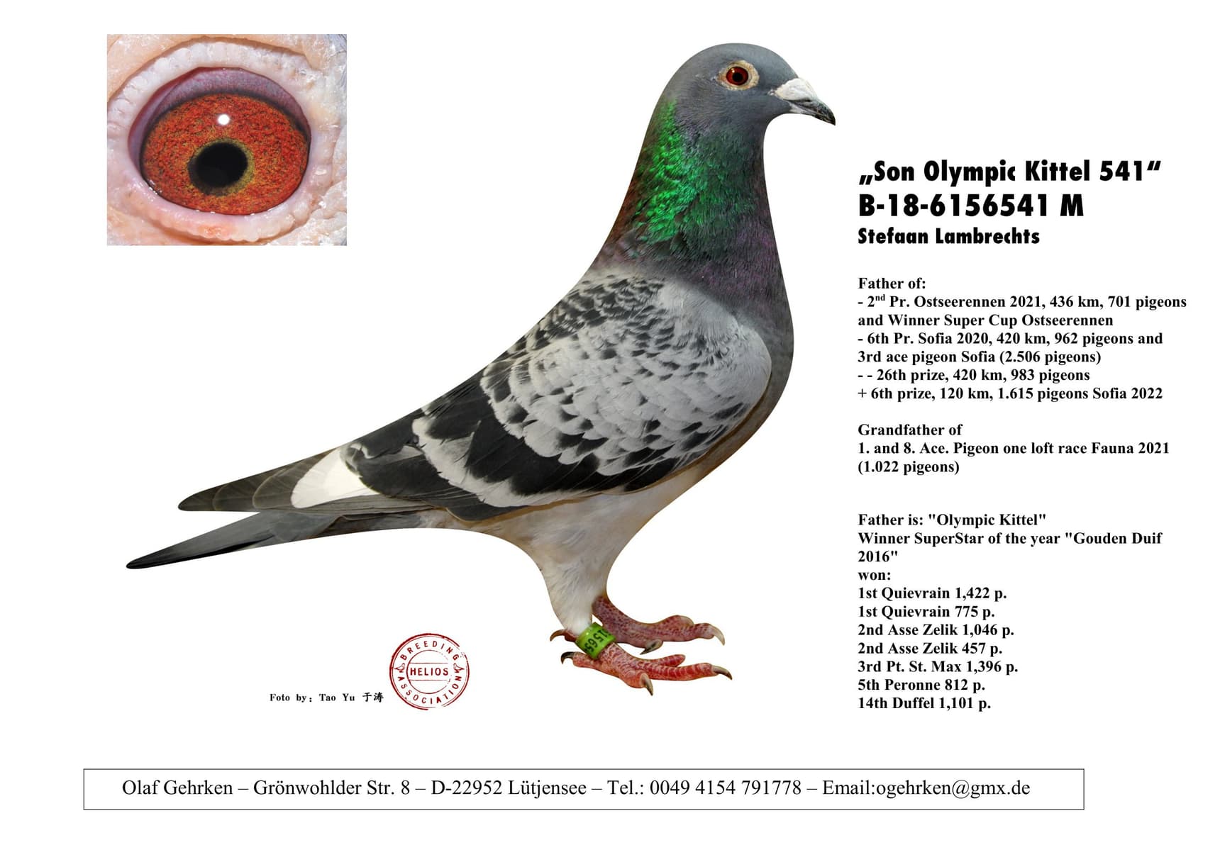 Born out “Olympic Kittel” (1st Quievrain 1,422b. – 1st Quievrain 775b. – 2nd Asse 1,046b. – 3rd Pont 1,396b. – 5th Peronne 812b.) x “Aunt of Lincia” (is a full sister to the mother of 1st Nat. ace ½ Fond youngbirds “Lincia”)