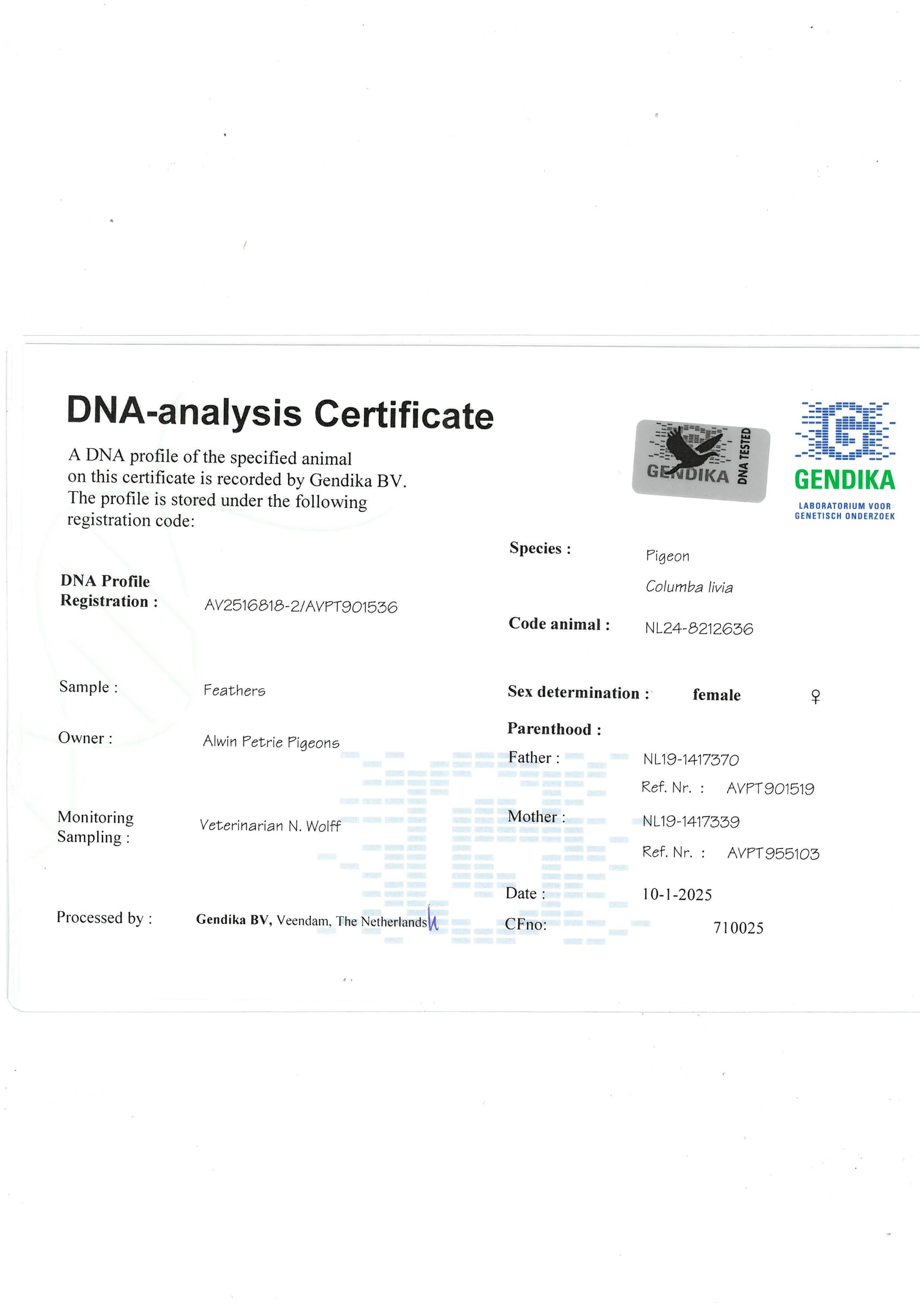 Born out “Father New Gigi” (100% Stefaan Lambrechts) x “Gigi’s Little Girl” (daughter “Gamelon” x “Gigi”)