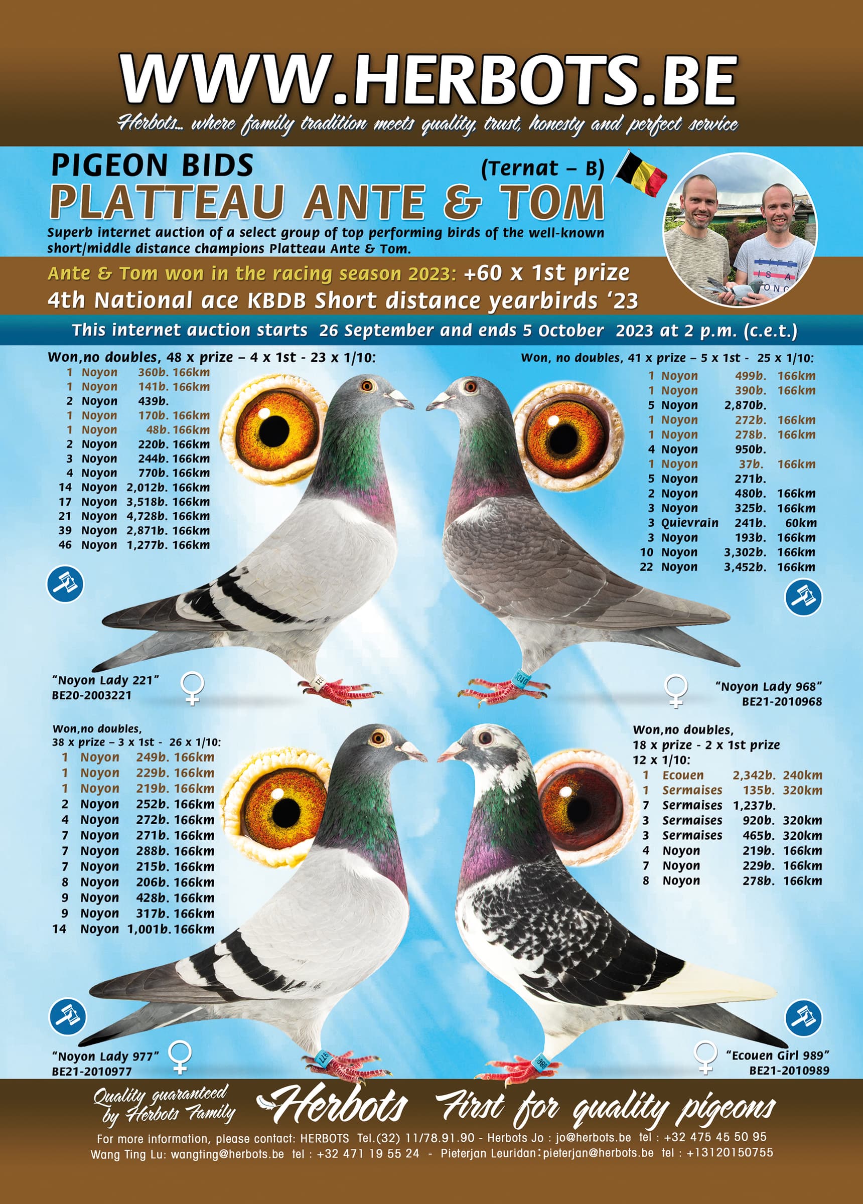 Famous short/middle distance racers Platteau Ante & Tom bring 16 well selected top performing birds into auction. Topbirds winning first prizes and prizes Top-10 and 1/10
