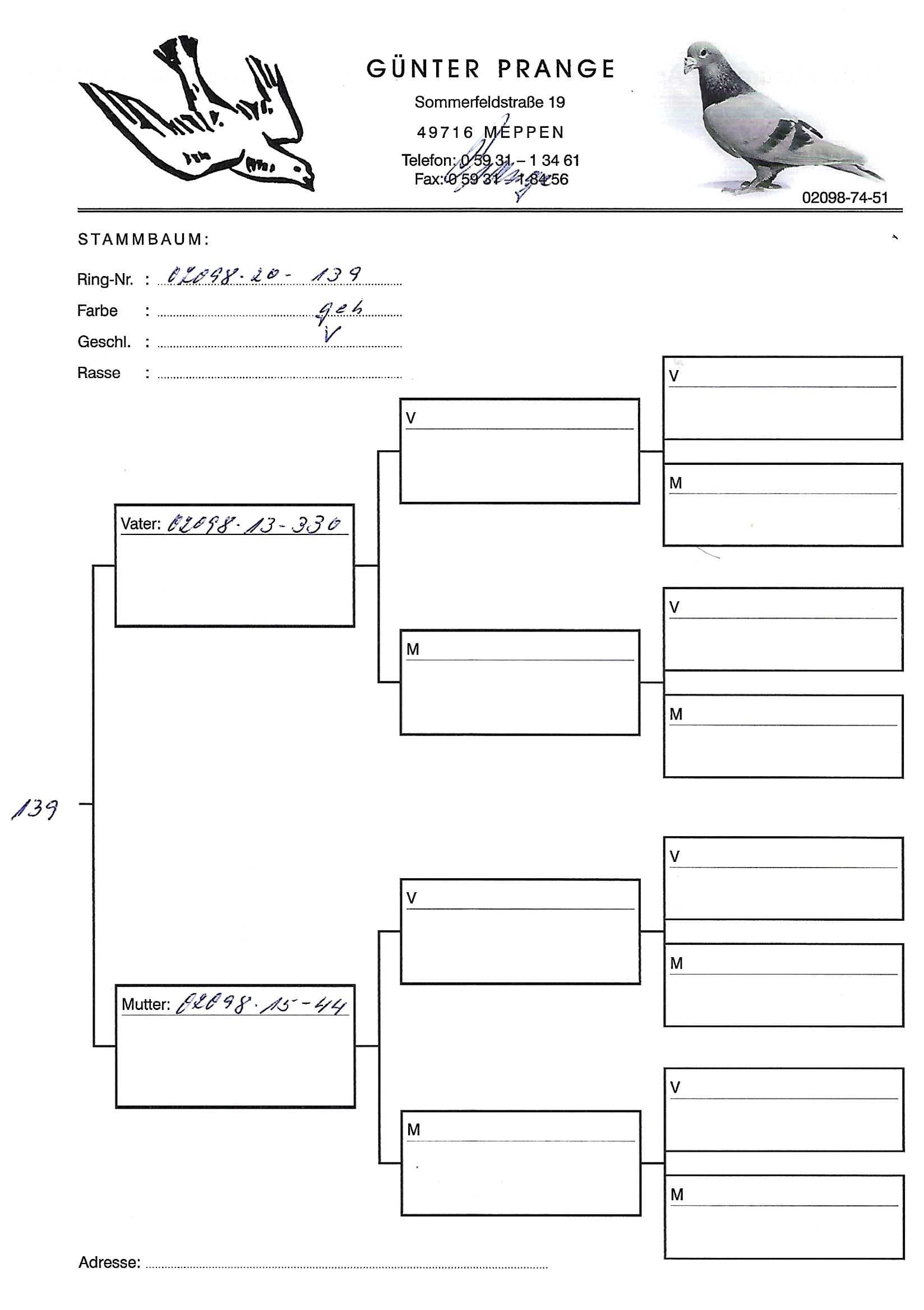 Grandson “Der 330” (DV02098-97-330) winner of 8 x 1st prize and father to 3rd Nat. ace Germany