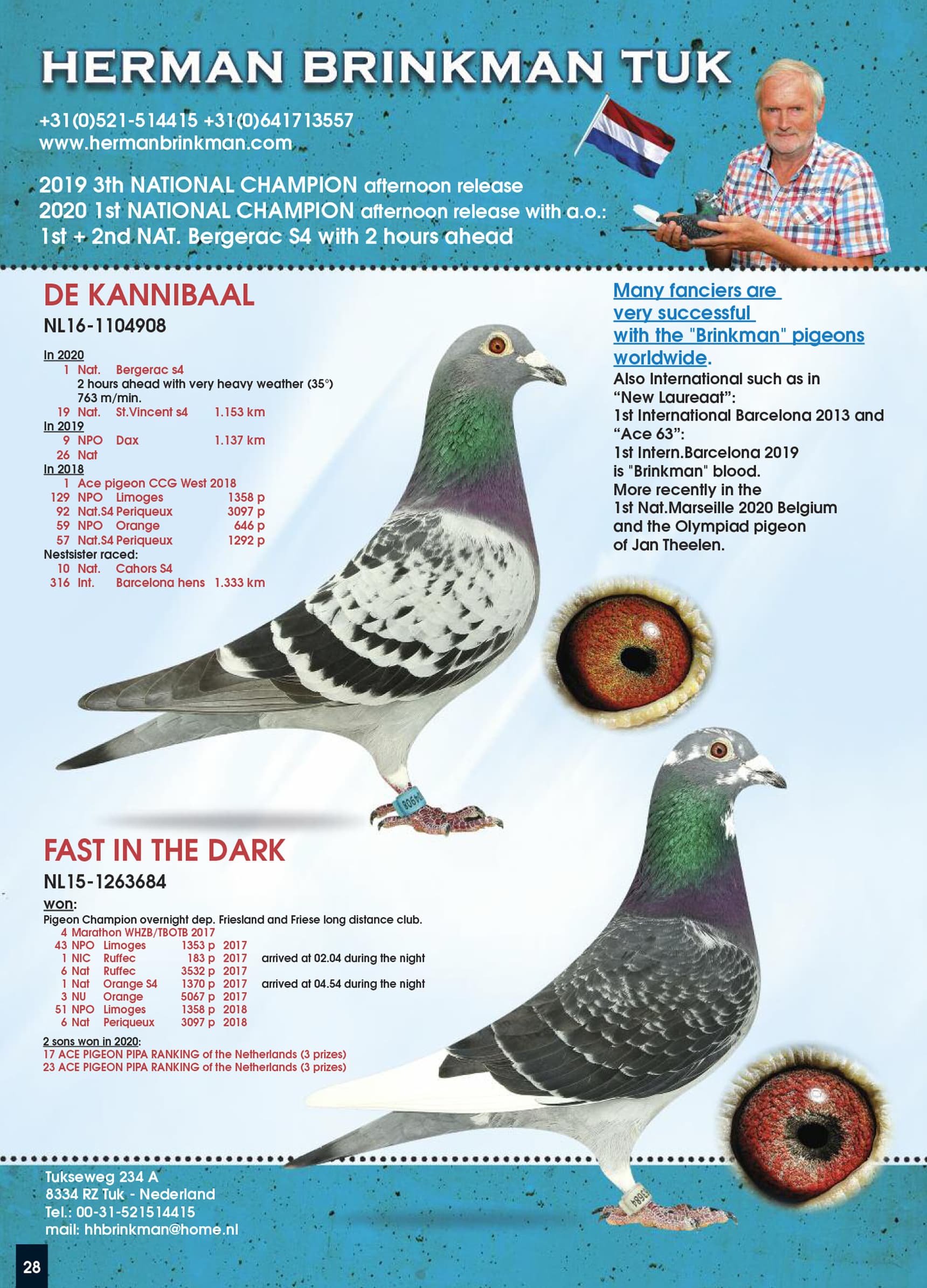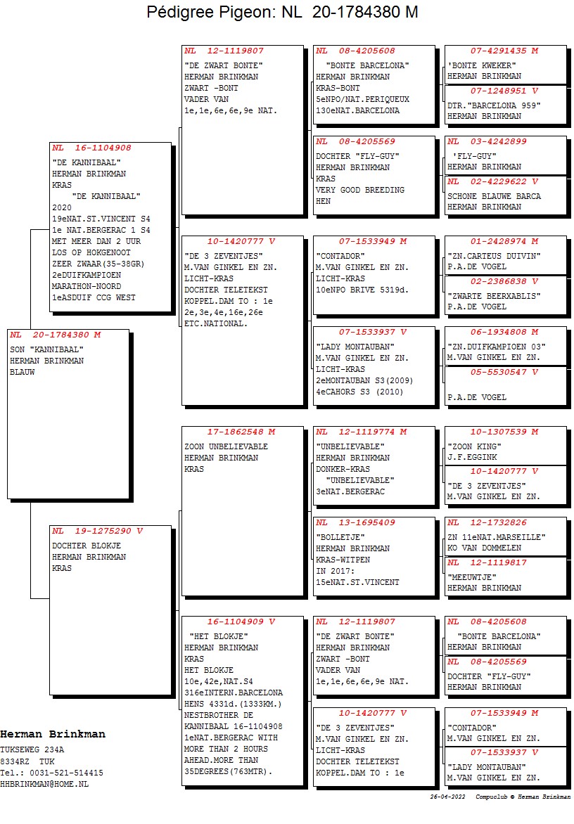 Born out “De Zwarte Bonte” (father to 1st, 1st,6th, 6th and 9th National S4 winners) x “De 3 Zeventjes” (original M. Van Ginkel – mother to 1st, 2nd, 3rd, 4th, 16th and 26th National S4 winners)