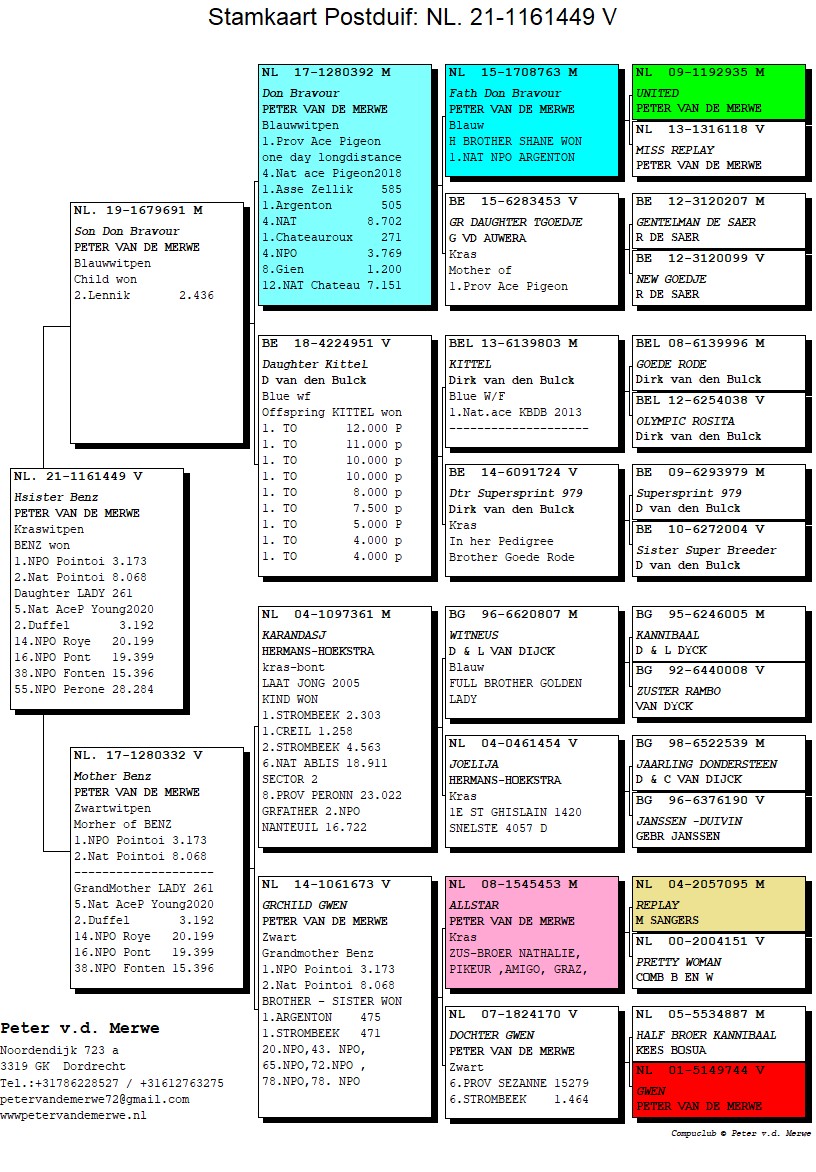 Born out the coupling “Don Bravour” (1st Prov. and 4th Nat. ace – 4th Nat. Argenton 8,702b. – 12th Nat. Chateauroux 7,151b.) x “Daughter Kittel” (direct daughter 1st Nat. ace KBDB “Kittel” – Van den Bulck)