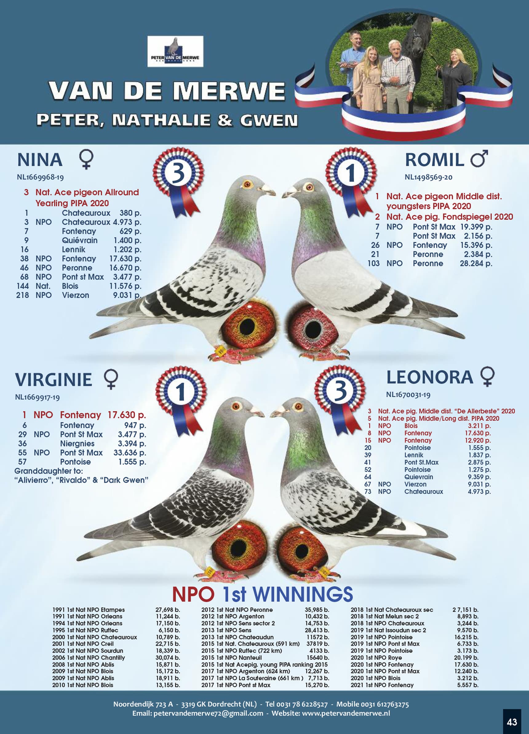 Brothers/sisters won: 1st Strombeek 2,303b. – 1st Creil 1,258b. – 2nd Strombeek 4,563b. – 6th Nat. Ablis 18,911b. – 8th Prov. Peronne 23,022b.