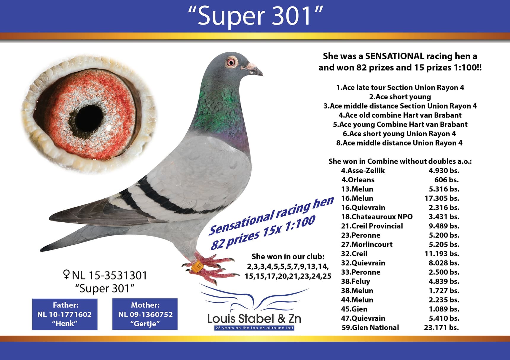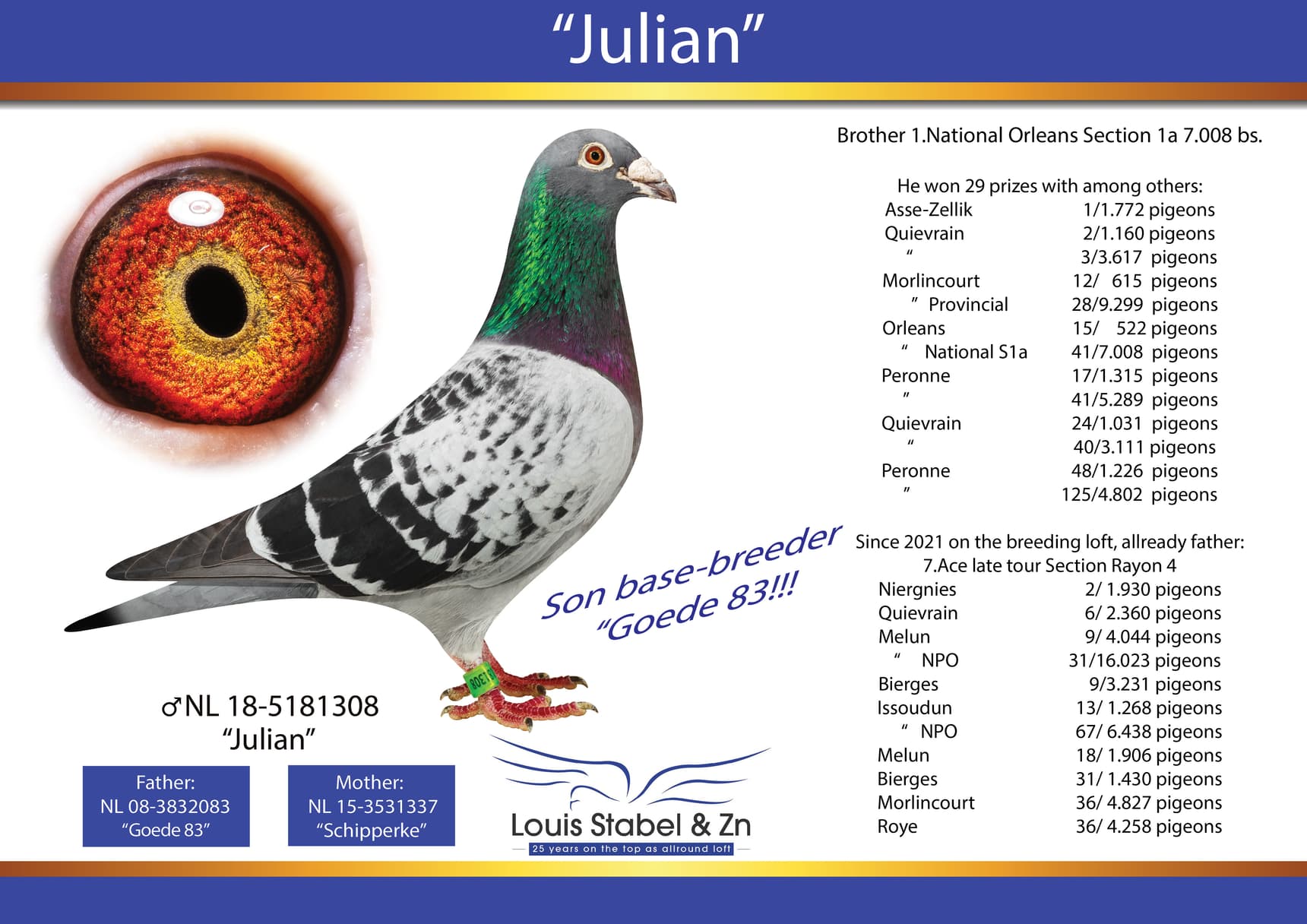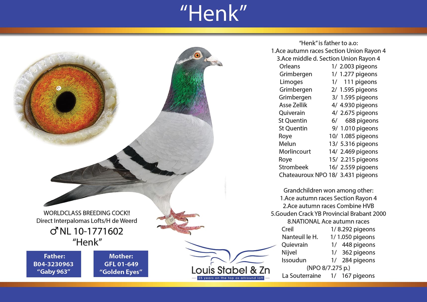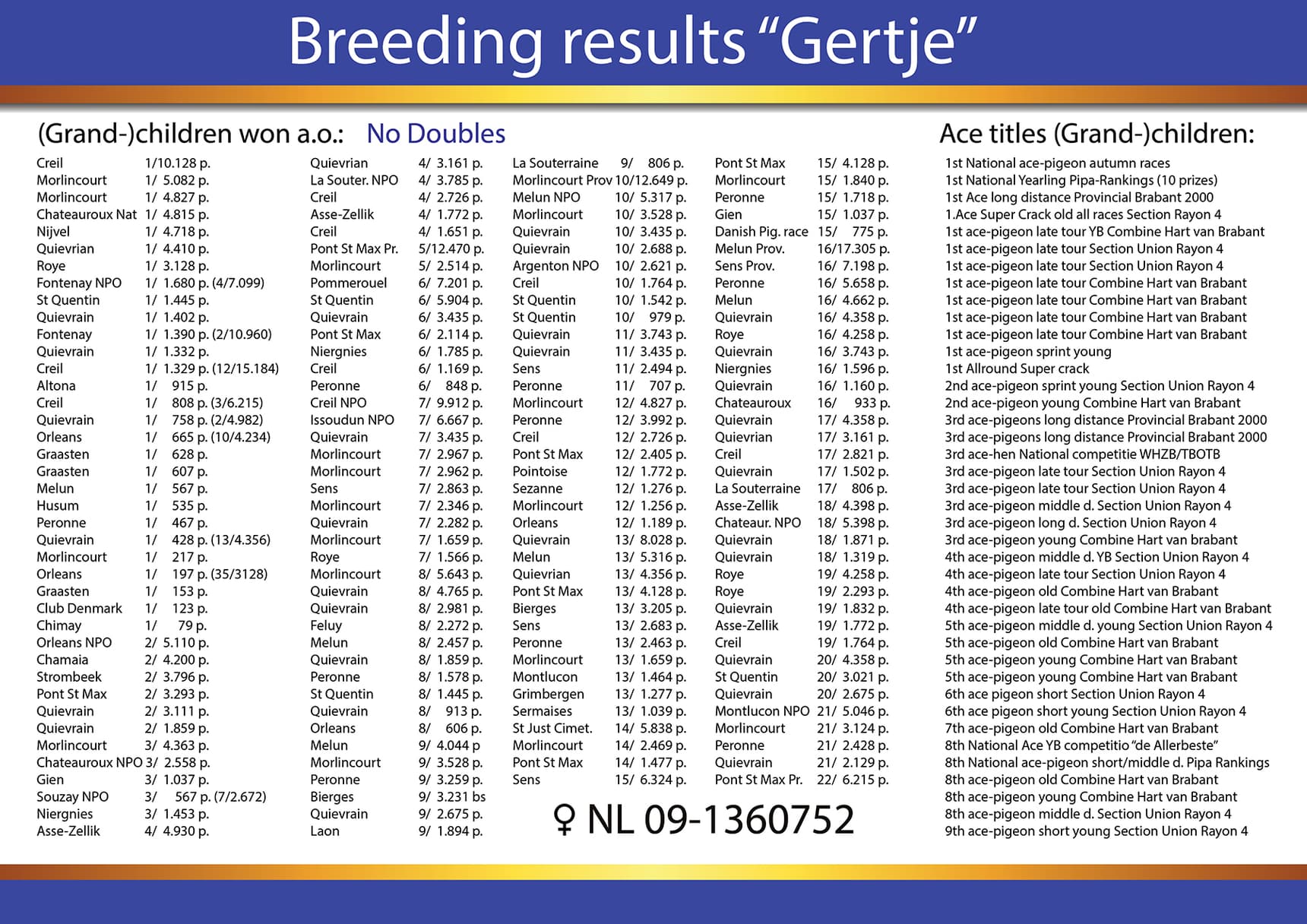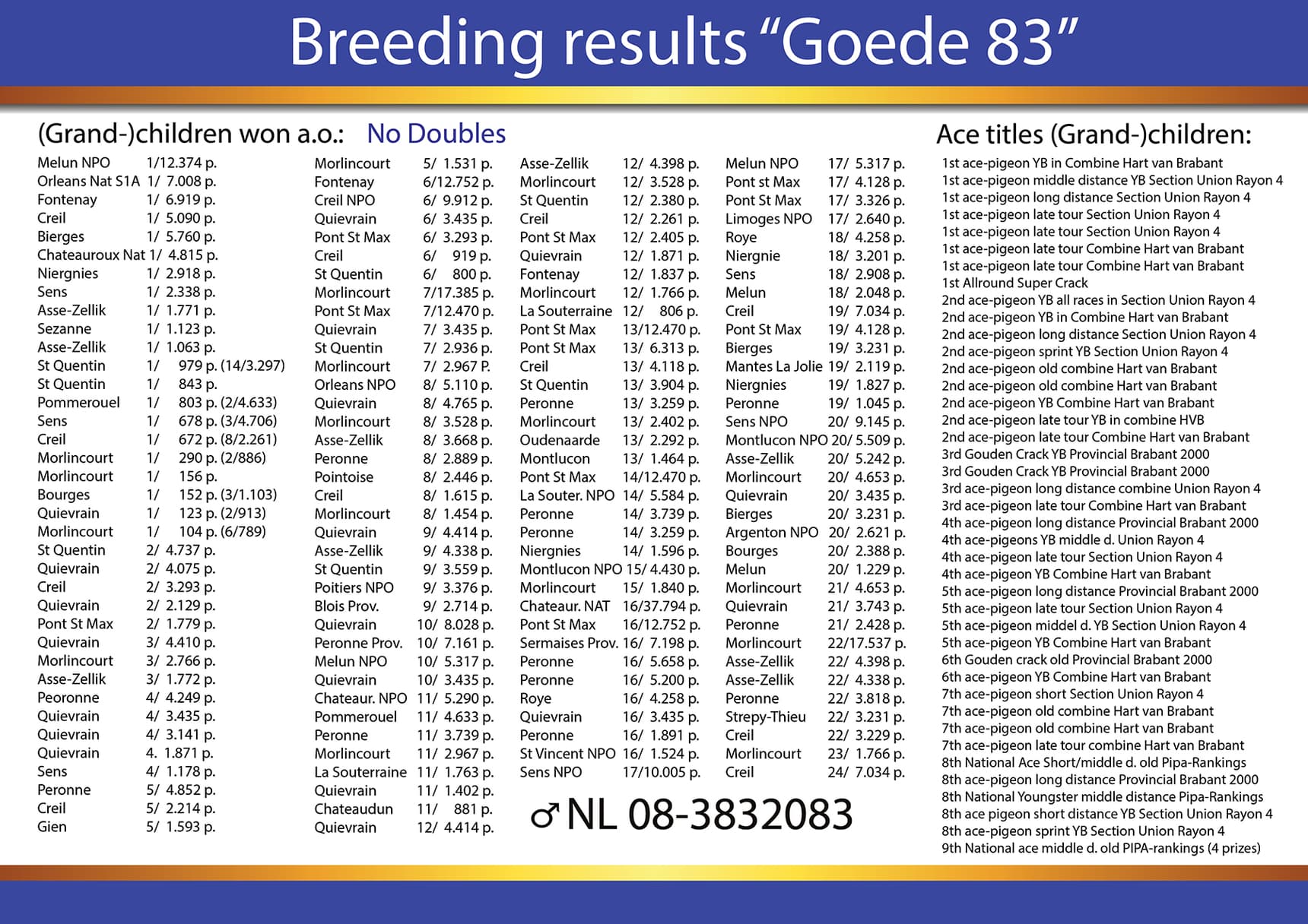 Direct son “Goede 83” (won 4th Nat. Bergerac 14,201b. - 8th NPO Poitiers 3,376b.) x “Schipperke” (won: 2nd Prov. ace youngbird Brabant 2000)