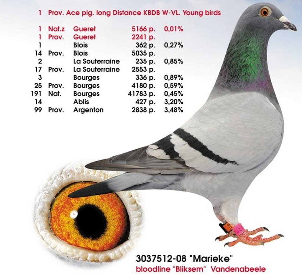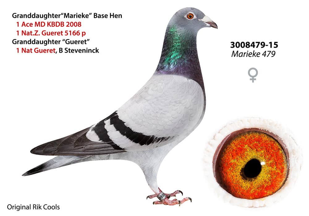 Is a son of “De Gueret” (1st Nat. Limoges at Steveninck) x “Marieke” (1st prov. ace KBDB – base breeding hen at Rik Cools)