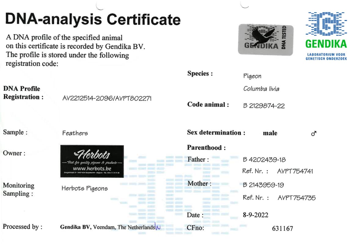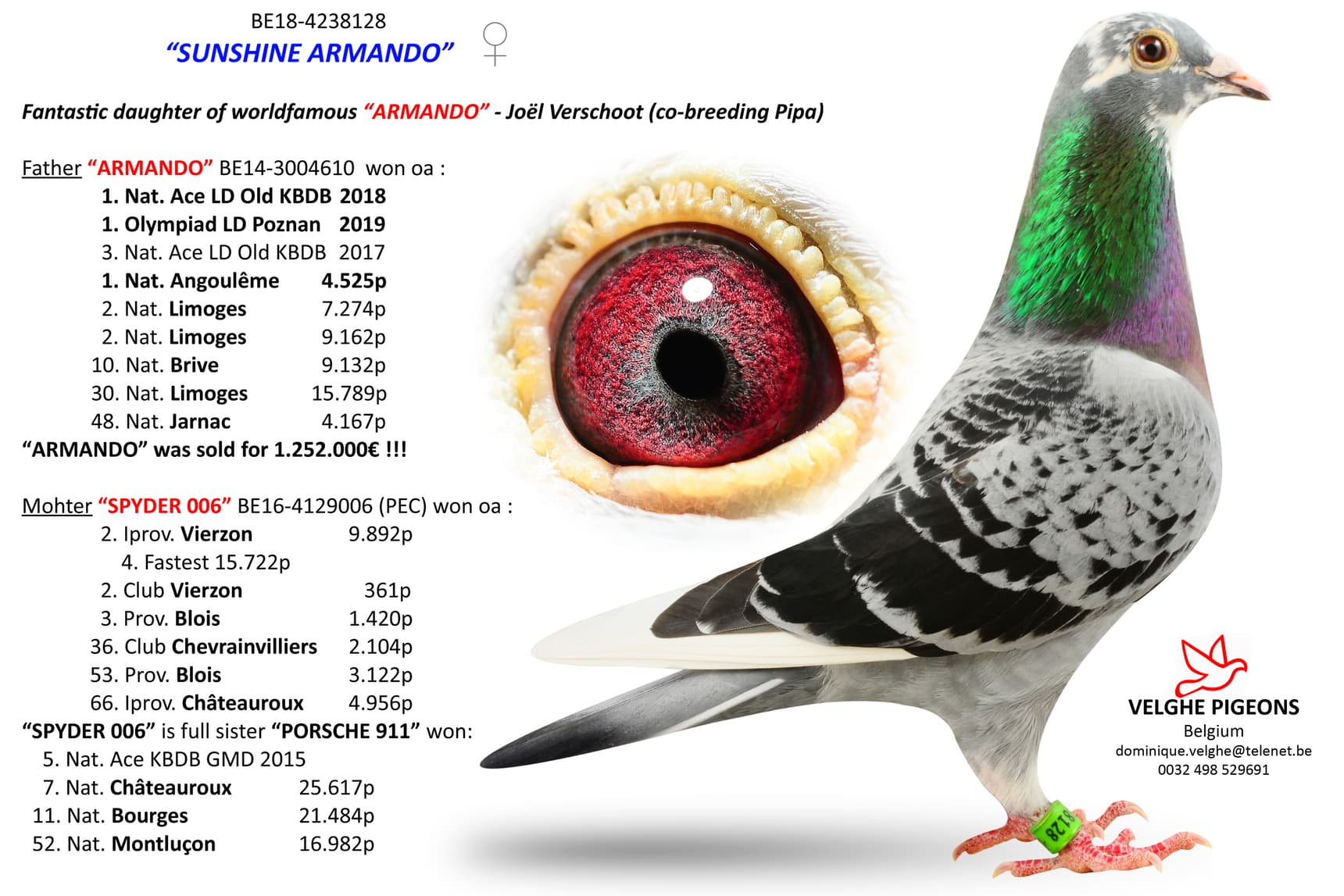 Direct daughter “Armando” (1st and 3rd Nat. ace Fond KBDB winner – Olympiad bird Fond Poznan) x “Spyder 006” (full sister “Porsche 911”)