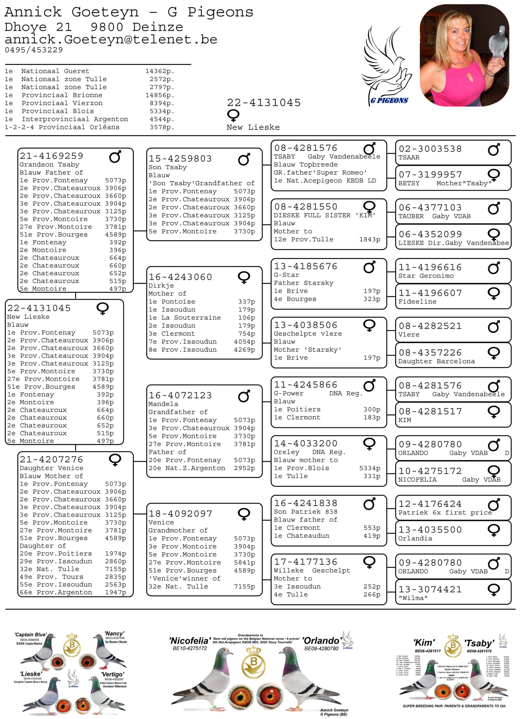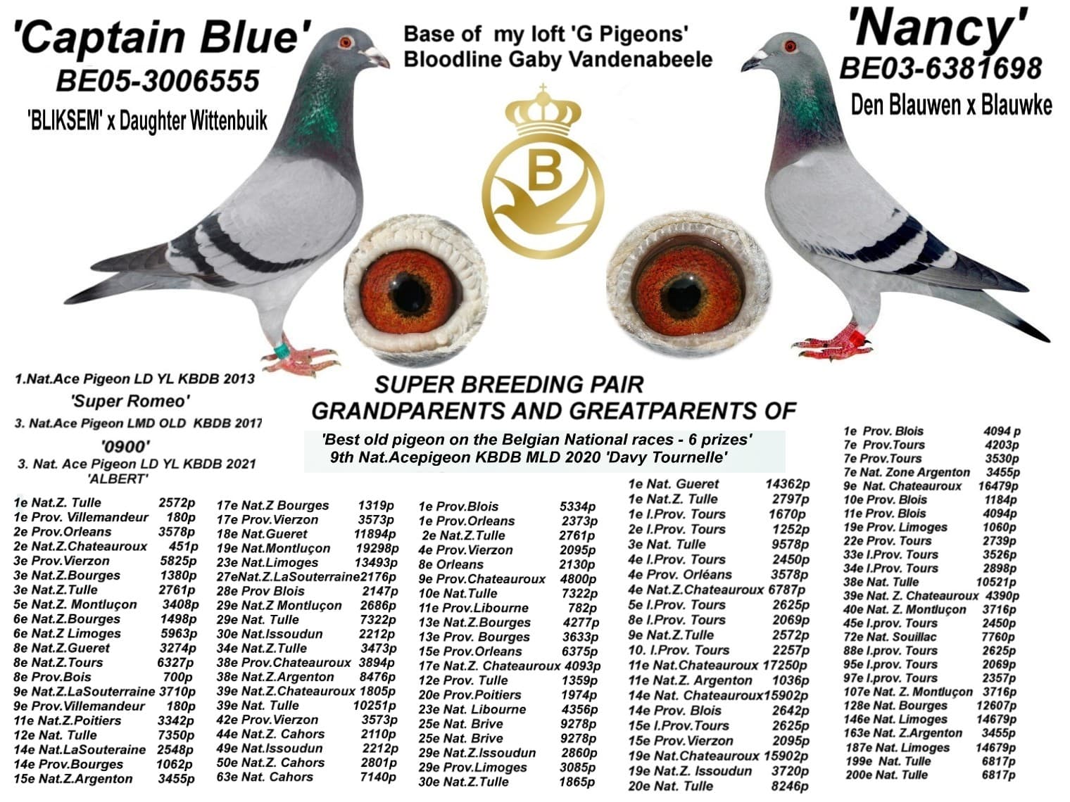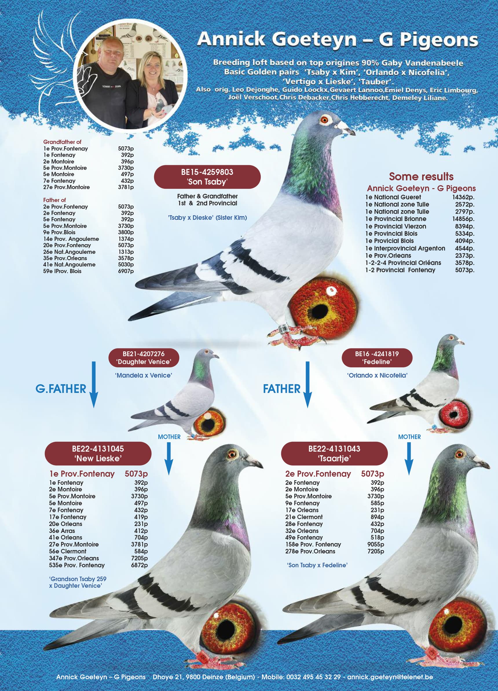 Direct daughter “Leono” (grandson “Neptunus” - Gaby Vandenabeele) x “Blue Icy” (granddaughter “Tsaby” – Gaby Vandenabeele)